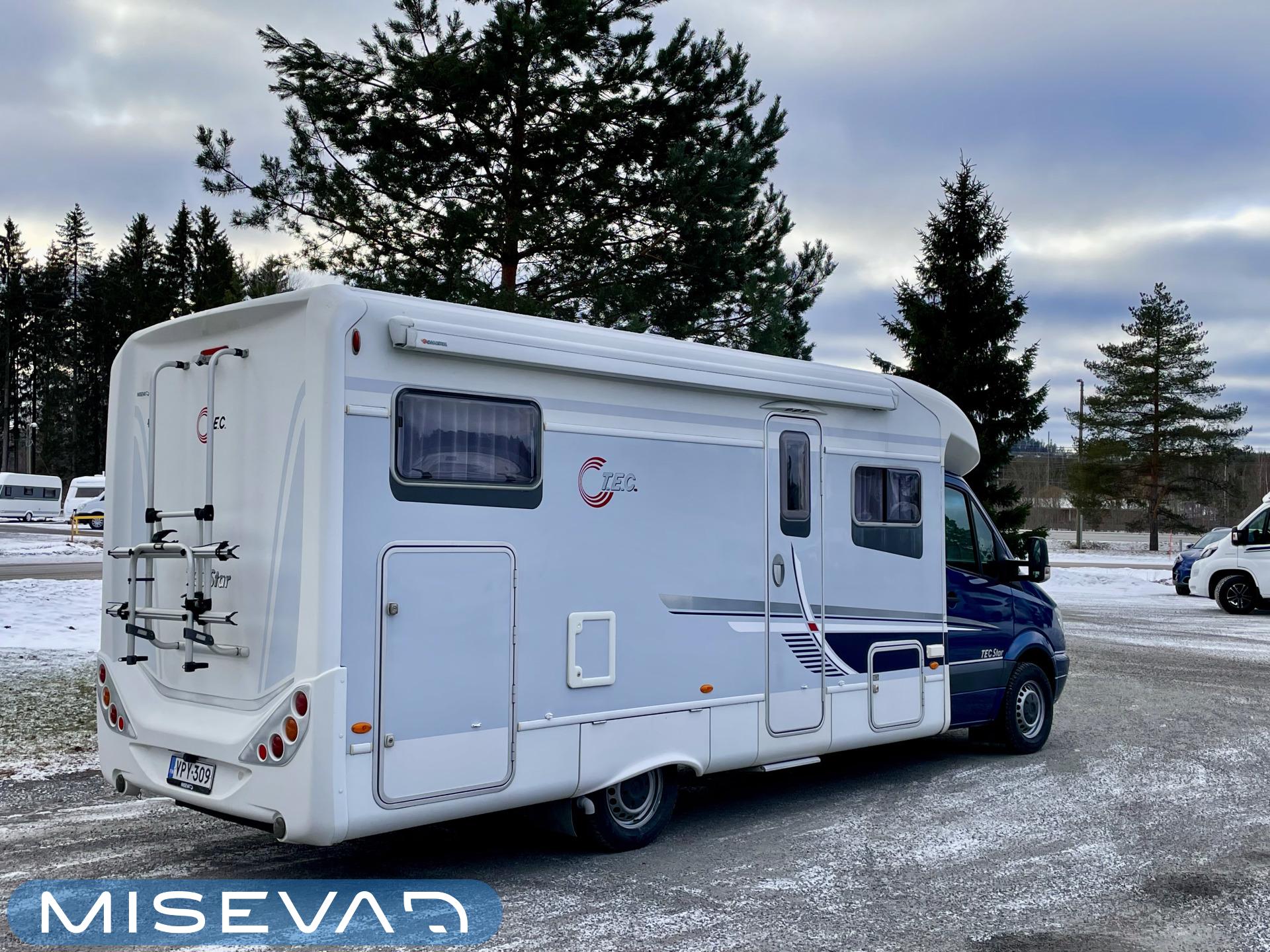 Tec Star, Johtotähti joka on sopivasti sisäänajettu seuraavaa onnellista omistajaa varten. Mersussa ei kilometrit paina ja tämän ratissa alkaakin helposti hymyilyttämään. Asuintilassa hymyily vain jatkuu kun Alde pitää tuvan lämpimänä ja kaasupullojakin varten on oma vaihtaja. Voi unohtaa ne aamuneljän herätykset pakkasessa kun kaasu on loppu. Asuintilan ohjainpaneelista voi suoraan katsoa tarvitaanko ulkona villasukkia vai laittaako Aldea vielä vähän lämpöisemmälle. Lämpötilat näkyy suoraan napin painalluksella. Ruokailuryhmä muotoutuu helposti kunnon lisäsängyksi ja takaosan sängyssä sitä onkin kuin omassa pesässään. Iso jääkaappi ja L-keittiö saa myös kokin hymyilemään. Ei ole riemulla rajaa kun Mersulla ajaa. Tule Turenkiin hymyilemään meidän kanssa ja tutustumaan tähän tähteen.