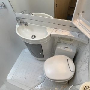 Pohjaratkaisussa edessä suuri alkovivuode, keskiosassa sohvaryhmä ja keittiö, takaosassa WC & Suihkutila sekä poikittainen parivuode.