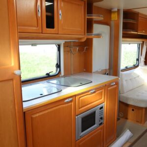 Pitkittäinen parivuode edessä, vieressä wc tila suihkulla. Keskellä keittiö ja pöytäryhmä. Takana tilava u-sohva.