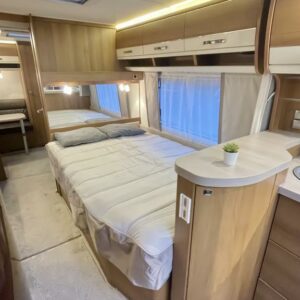Pohjaratkaisussa edessä muhkea U- sohvaryhmä josta pedattavissa vuode sekä keittiö. Keskiosassa pitkittäinen parivuode sekä kaappitilaa. Takaosassa Wc & suihkutila sekä toinen sohvaryhmä ja kerrosvuoteet!