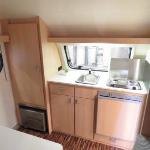 Takana tilava istuinryhmä, joka sijattavissa parivuoteeksi tai erillisvuoteiksi. Edessä keittiö, jossa jääkaappi ja liesi.