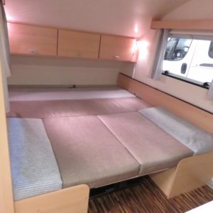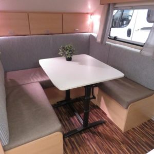 Takana tilava istuinryhmä, joka sijattavissa parivuoteeksi tai erillisvuoteiksi. Edessä keittiö, jossa jääkaappi ja liesi.