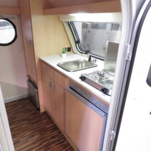 Takana tilava istuinryhmä, joka sijattavissa parivuoteeksi tai erillisvuoteiksi. Edessä keittiö, jossa jääkaappi ja liesi.