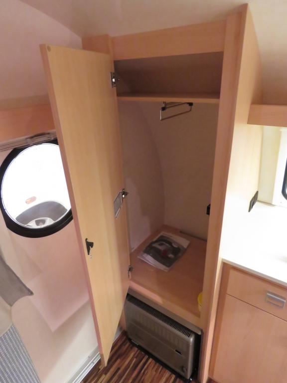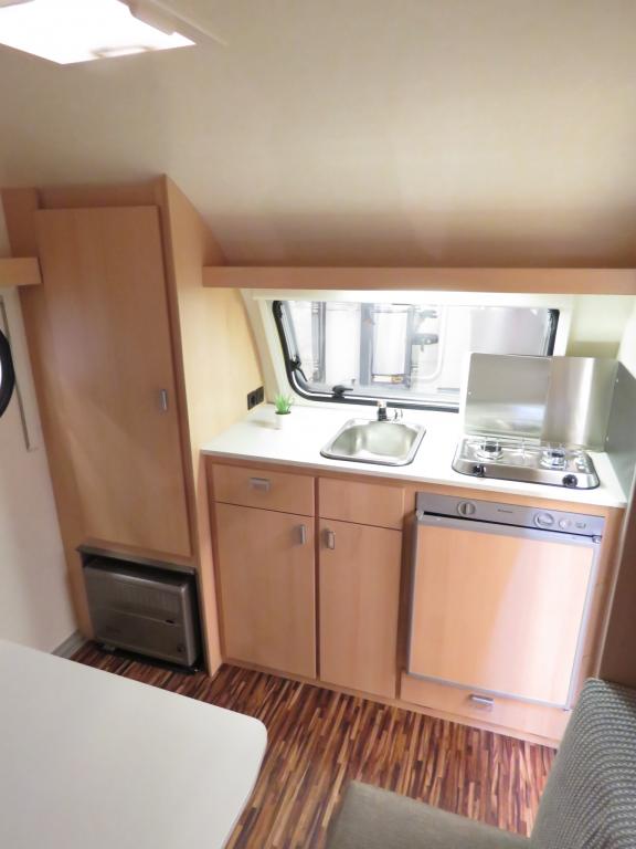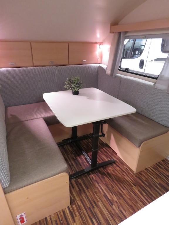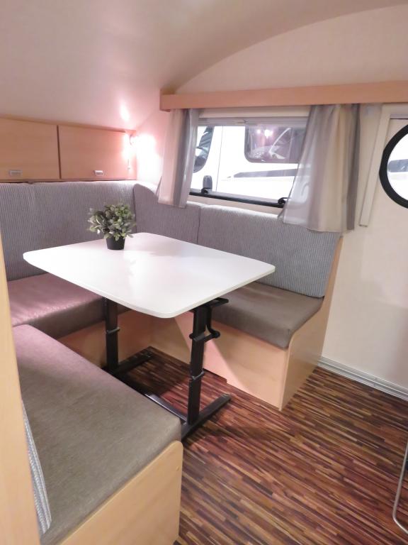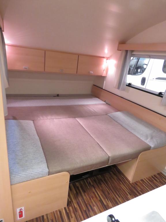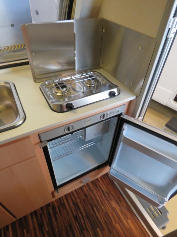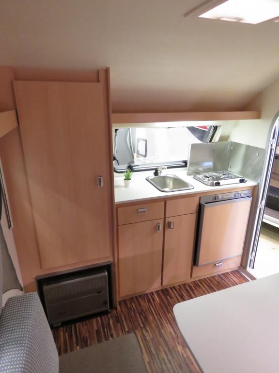 Takana tilava istuinryhmä, joka sijattavissa parivuoteeksi tai erillisvuoteiksi. Edessä keittiö, jossa jääkaappi ja liesi.