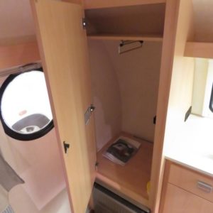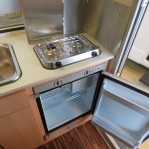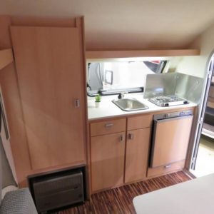 Takana tilava istuinryhmä, joka sijattavissa parivuoteeksi tai erillisvuoteiksi. Edessä keittiö, jossa jääkaappi ja liesi.
