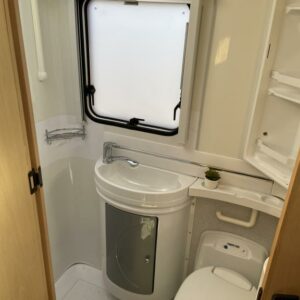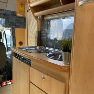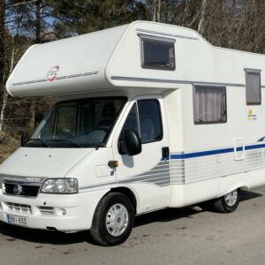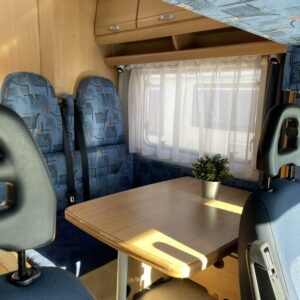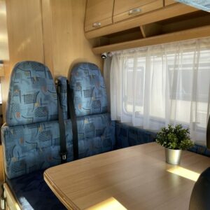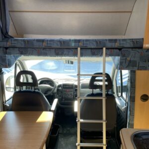 Takana kerrosvuoteet joista alemman saa nostettua pystyyn jolloin iso tallitila, keskellä keittiö ja istuinryhmä 4:lle josta parivuode, ohjaamon päällä alkovivuode 2:lle.