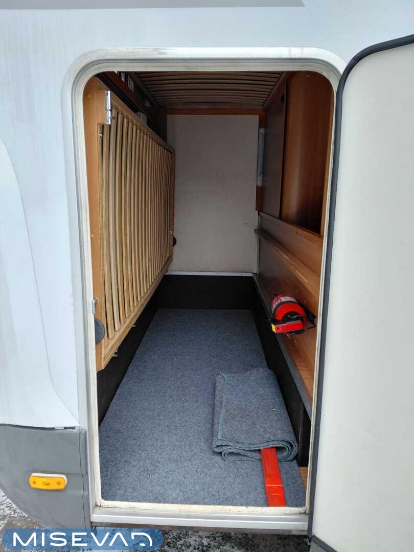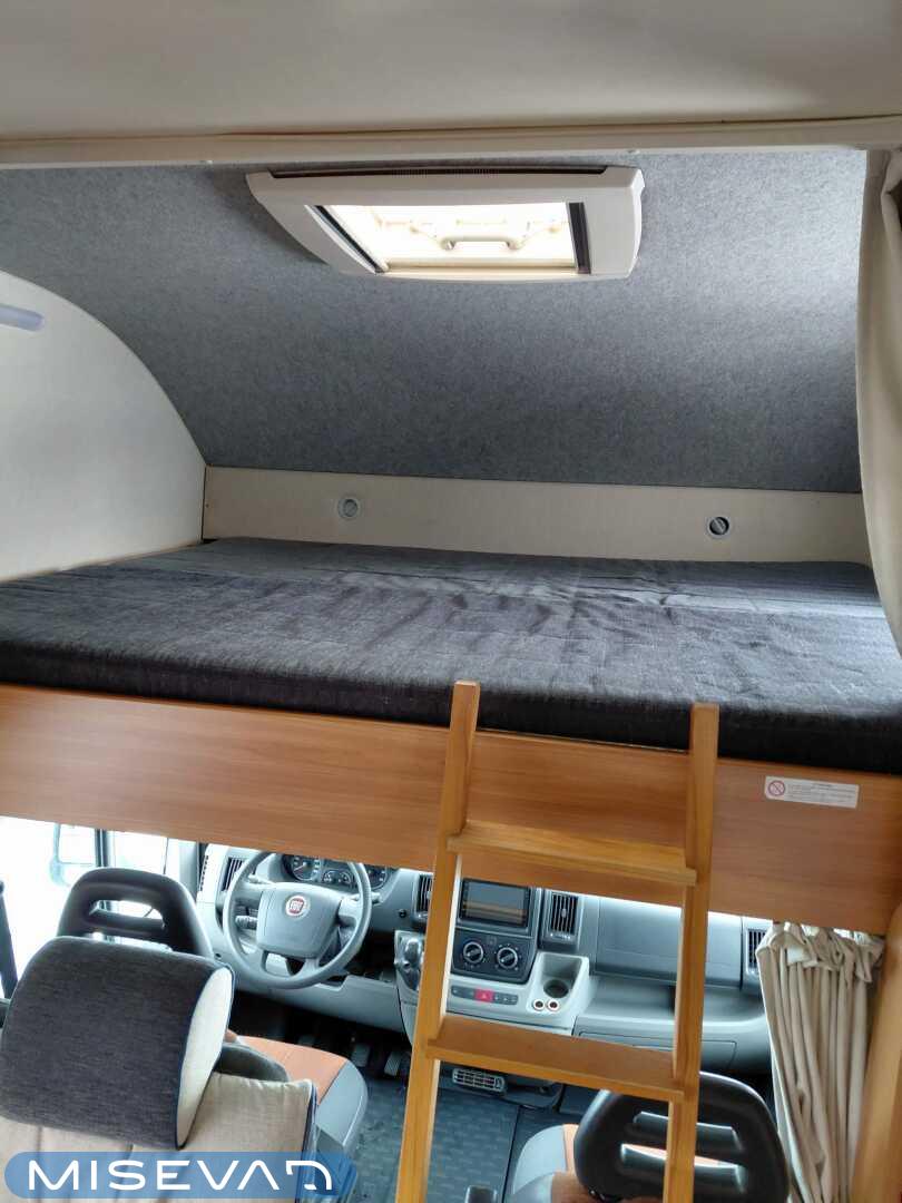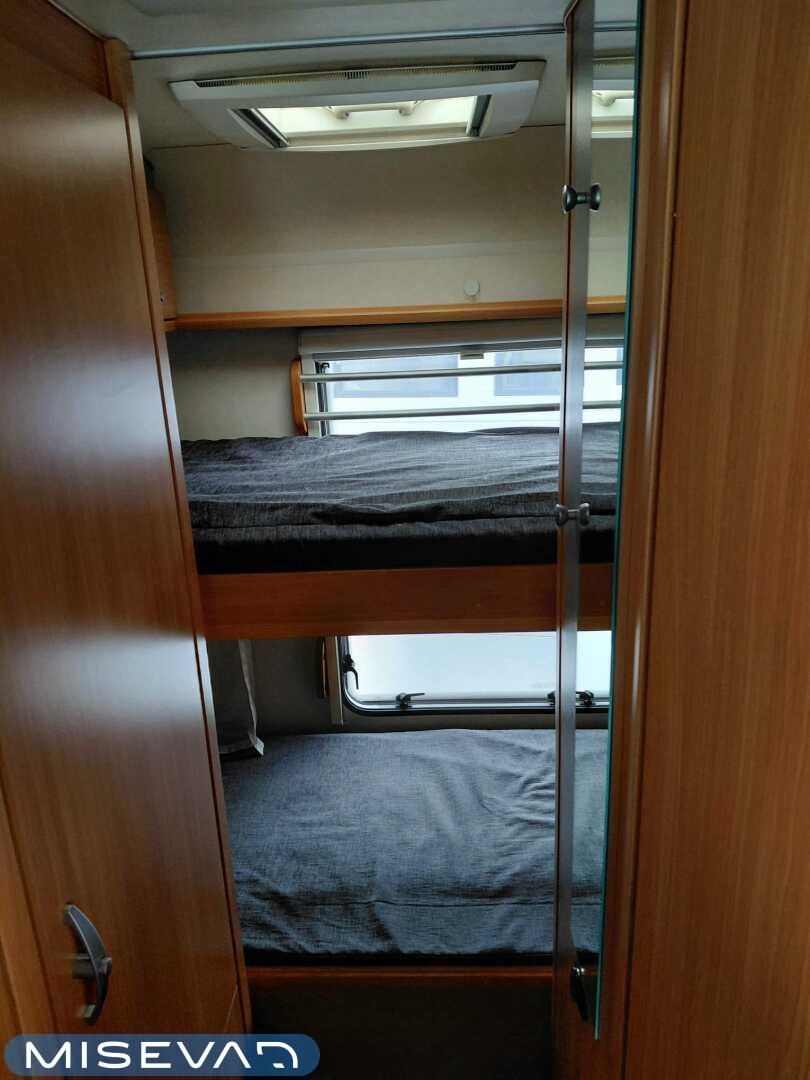 Takana pitkittäissuuntaisesti sijaitsevat erillisvuoteet ovat pituuksiltaan 195 ja 185cm ja vuoteet ovat keskeltä yhdessä. Keskellä autoa on keittiö ja nyt kun on kyseessä hieman pidemmän akselivälin omaava retkiauto, niin keittiöstä löytyy jopa laskutilaa tavaroille. Jääkaappi on kätevää vetolaatikkomallia ja se sijaitsee keittiön etu päädyssä. Keittiön vieressä on WC ja kylppäritilat. Etuosassa on pöytäryhmä kääntyvillä etupenkeillä. Lämmitimenä toimii Trumaticin 6 kilowattinen dieseltoiminen ilmapuhallinlämmitin ja polttoaineen lämmitin ottaa auton omasta tankista. Aika näppärä syysteemi ja säästää kaasupullojumpalta etenkin talvikeleillä. Lämmittimessä on myös integroituna sähkövastukset (sähköpatruuna) ja lämminvesiboileri. Auton oman ohjaamoilmastoinnin lisäksi on asunto-osalle oma verkkovirtatoiminen ilmastointi. Varustelistaa täydentää aurinkopaneeli, markiisi, ulkosuihku, kaasupullon vaihtaja, sekä vetokoukku. Takaoviin on integroitu paikat kahden hengen pihapöytäryhmälle (2 tuolia + pöytä).