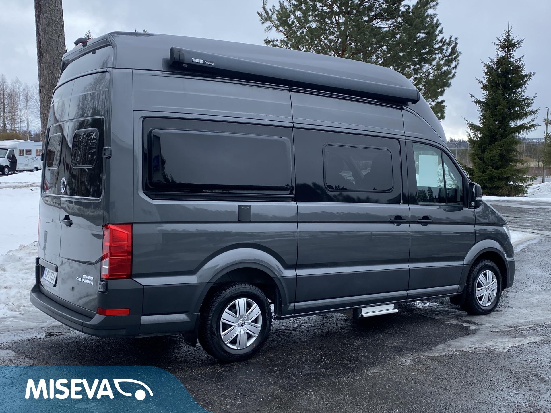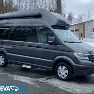 Grand California 600, ihanteellinen matkailuauto perheen yhteisille matkoille. 6 metrin pituus tekee autosta kompaktin ja helposti käsiteltävän pienemmässäkin tilassa. Auto on myös tarpeeksi tilava nelihenkiselle perheelle. Tämän mahdollistaa uudenlainen camper-katto ylävuoteineen. Keittiöstä löytyy kaikki tarpeelliset toiminnot ruoan laittoon ja jääkaapi on kätevästi vetolaatikkomallinen. Jääkaapista löytyy tilavuutta peräti 70 litraa. Autosta löytyy myös tyylikkäät WC/kylpyhuonetilat ja extrana vielä ulkosuihku auton takaosassa. Lämmittimenä on Trumaticin ilmakeskuslämmitys ja sähkövastuksilla varustettuna. Pihan puolelle lisätilaa saadaan markiisin avulla. Takaovissa on säilytystila kätevälle retkisetille (pöytä ja kaksi tuolia) eli ne kulkevat aina mukana. Alustana on VW Crafter mikä on ajomukavuudeltaan erinomainen. Luonnollisestihan tästä löytyvät kaikki nykyaikaiset turva, sekä mukavuusvarusteet. Näistä mainittakooon mm. lämmitetyt ratti ja tuulilasi. Infokeskuksena on iso kosketusnäyttö mikä toimii myös peruutuskameran näyttönä. Kylmäkäynnistyksiä varten on varustelistalla myös kauko-ohjattu polttoainetoiminen lisälämmitin. Ihan mahtavan hieno, tyylikäs ja moderni paketti valmiina reissuun!