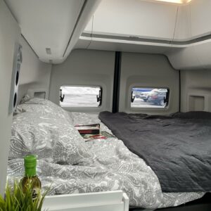 Takana poikittainen parivuode minkä alapuolella mukavasti säilytystilaa. Keskellä WC/kylpyhuonetilat sekä keittiö. Edessä pöytäryhmä minne yhdistyvät kääntyvät ohjaamon penkit. Pöytäryhmän yläpuolella camber ylävuode kahdelle henkilölle.