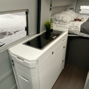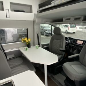 Takana poikittainen parivuode minkä alapuolella mukavasti säilytystilaa. Keskellä WC/kylpyhuonetilat sekä keittiö. Edessä pöytäryhmä minne yhdistyvät kääntyvät ohjaamon penkit. Pöytäryhmän yläpuolella camber ylävuode kahdelle henkilölle.
