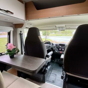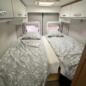 Erillisvuoteiden ansiosta matkakumppanin mahdolliset yöheräilyt eivät keskeytä unia. Auton etuosasta löytyy viihtyisä ja valoisa pöytäryhmä neljälle. Yhdistetystä pesuhuone/ WC- tilasta löytyy mukavana yksityiskohtana pieni ikkuna, joka mahdollistaa suihkun käytön myös auton ulkopuolella.