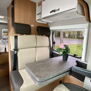 Erillisvuoteiden ansiosta matkakumppanin mahdolliset yöheräilyt eivät keskeytä unia. Auton etuosasta löytyy viihtyisä ja valoisa pöytäryhmä neljälle. Yhdistetystä pesuhuone/ WC- tilasta löytyy mukavana yksityiskohtana pieni ikkuna, joka mahdollistaa suihkun käytön myös auton ulkopuolella.