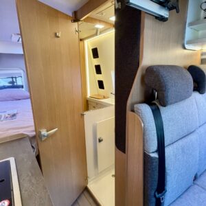 Takapäästä löytyy pitkittäiset erillisvuoteet ja tavaratila.