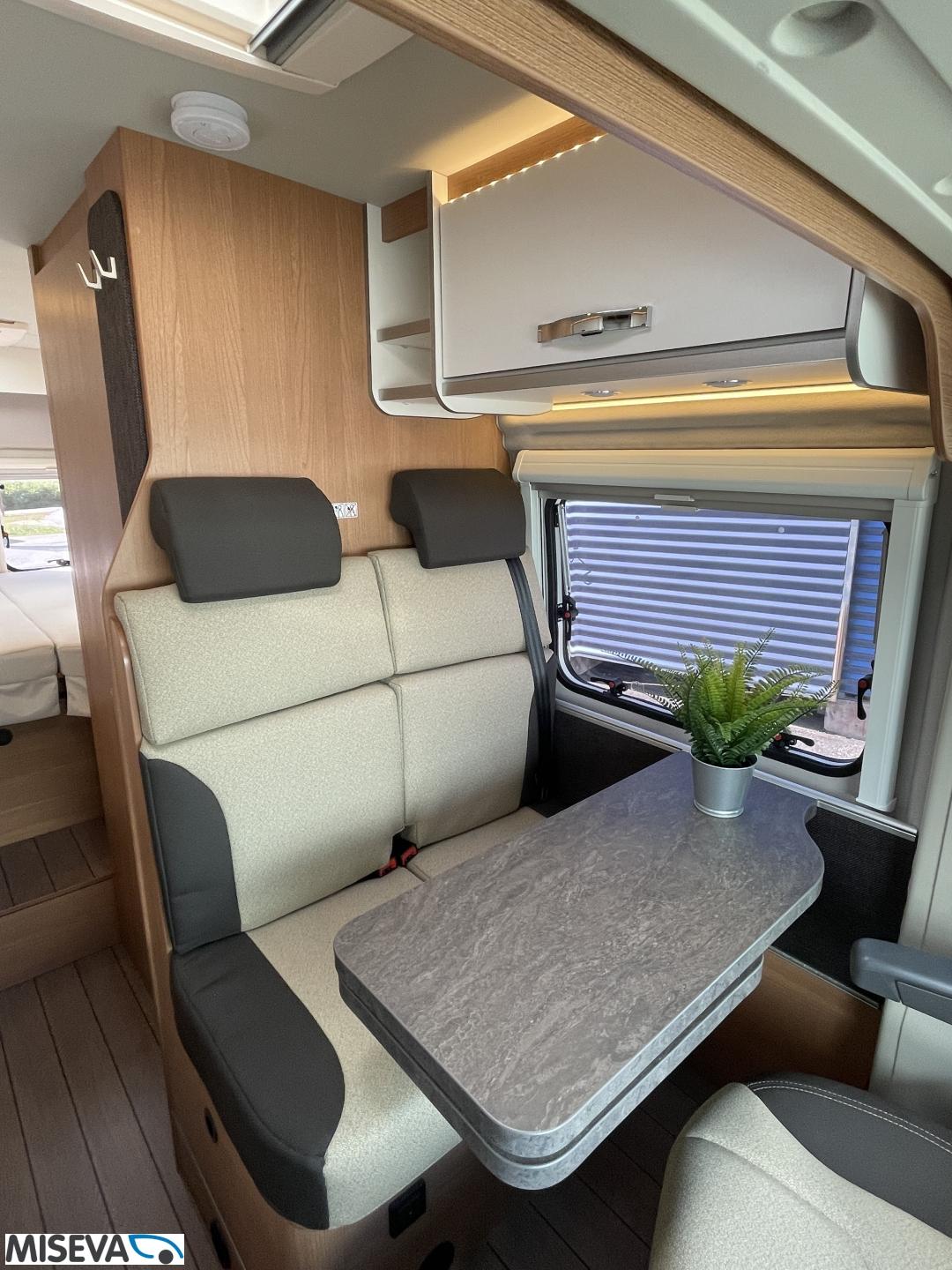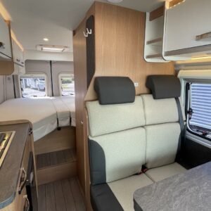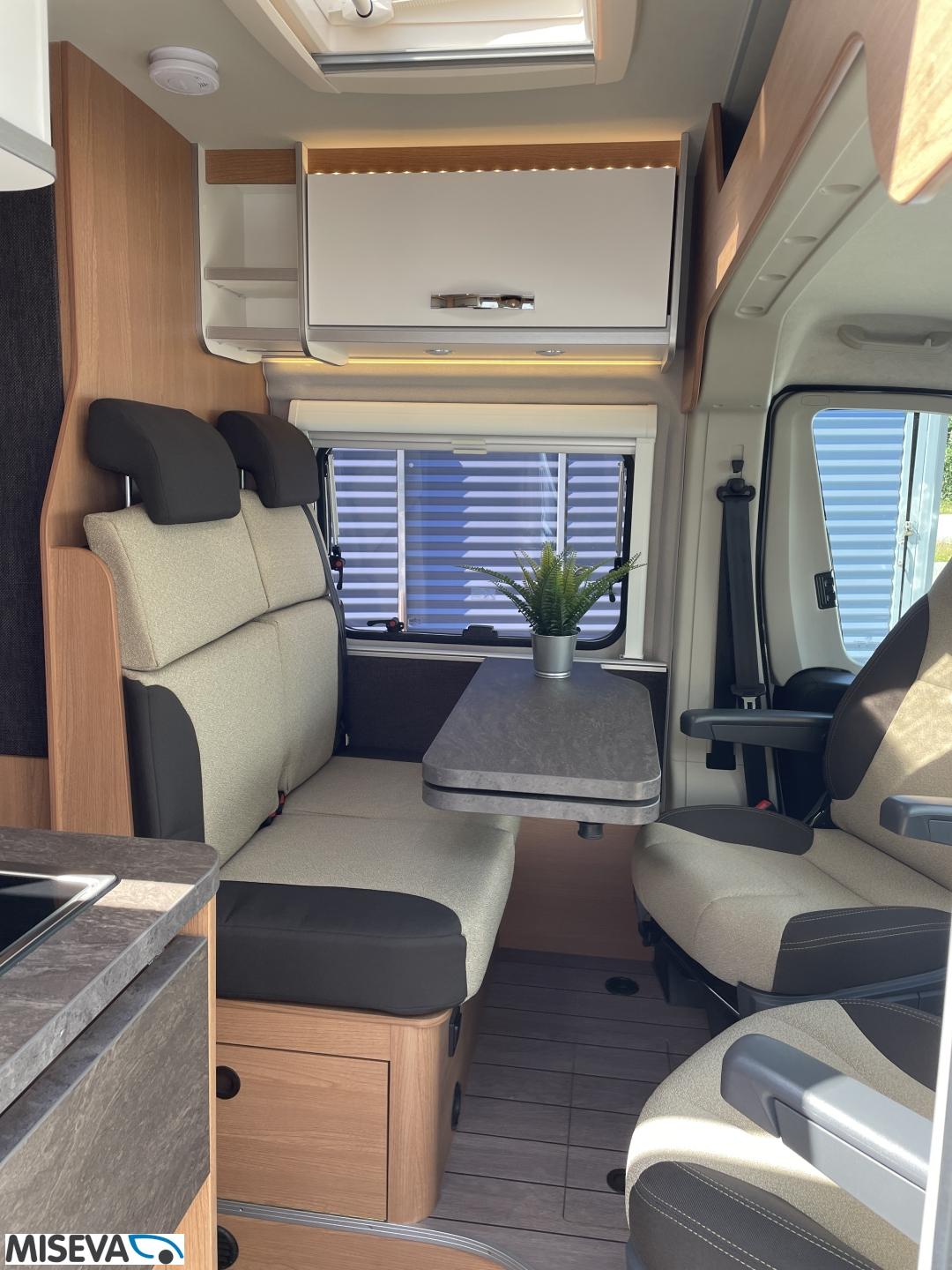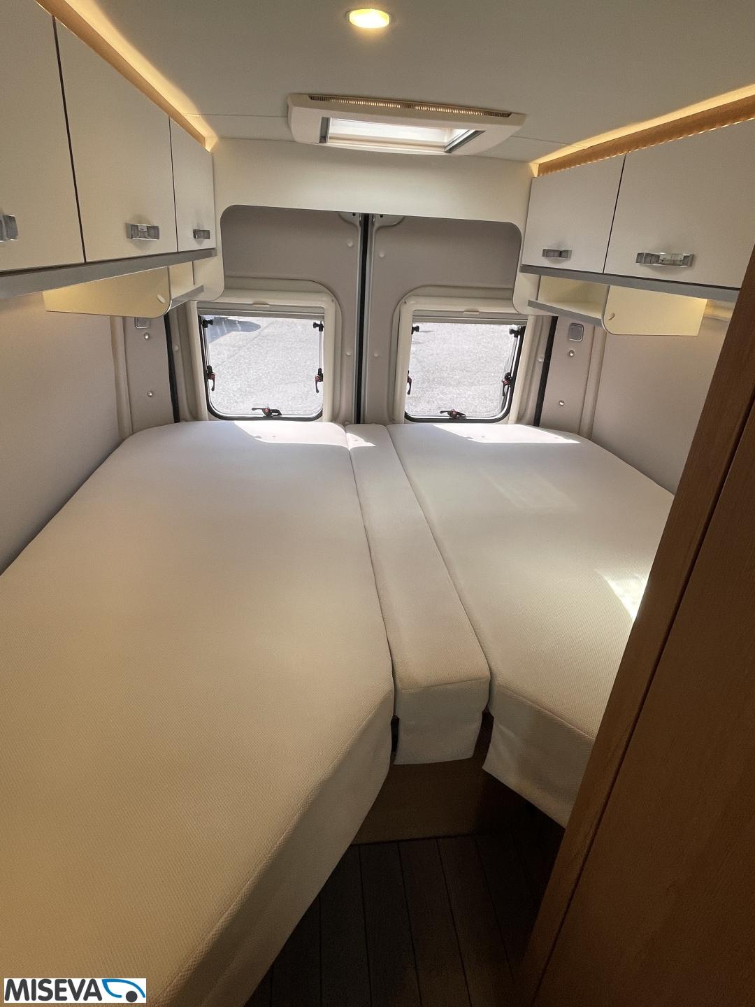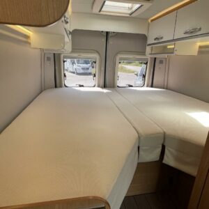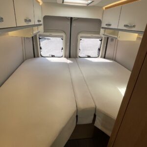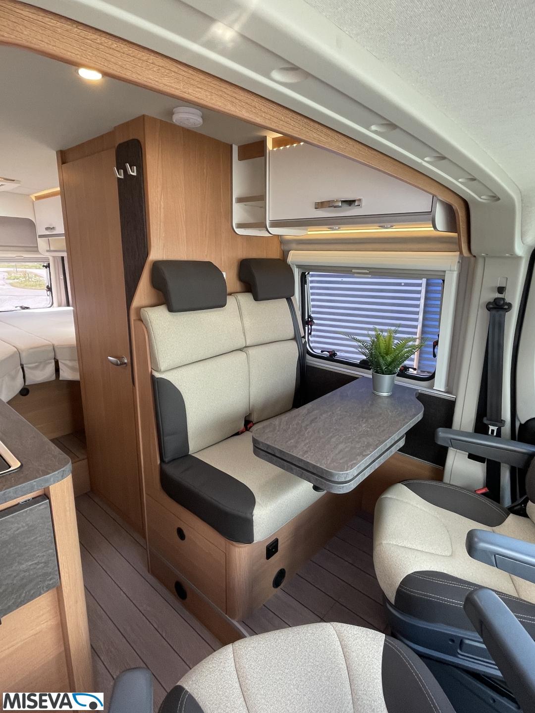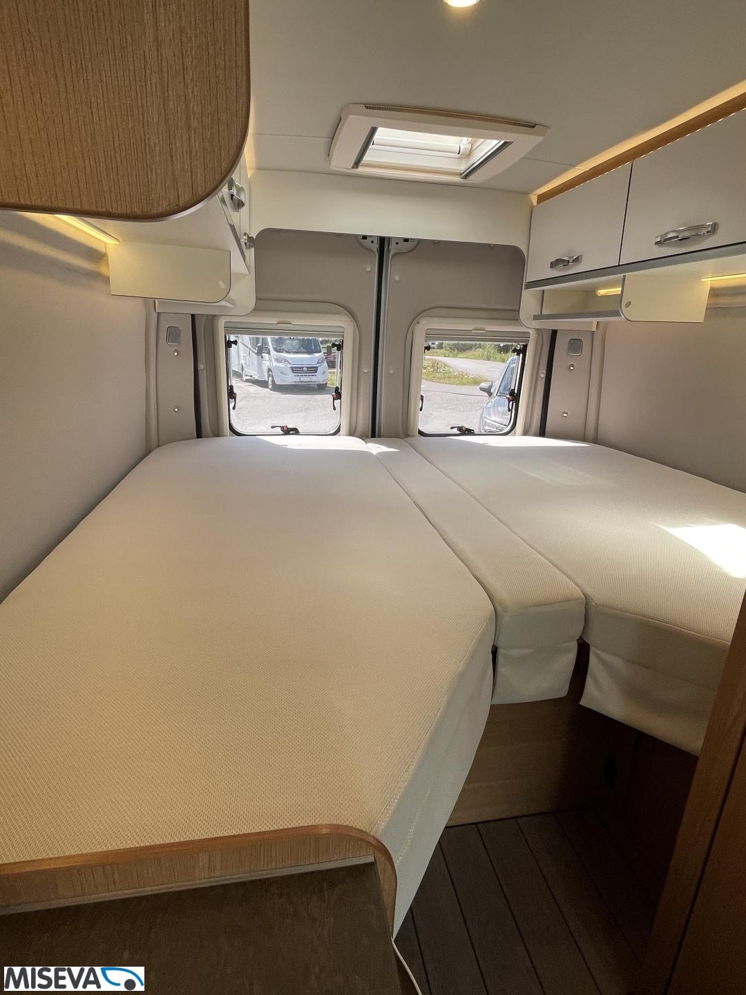 Kuuteen metriin pakattua liikkumisenvapautta halutulla pohjaratkaisulla. Erillisvuoteiden ansiosta matkakumppanin mahdolliset yöheräilyt eivät keskeytä unia. Auton etuosasta löytyy viihtyisä ja valoisa pöytäryhmä neljälle. Yhdistetystä pesuhuone/ WC- tilasta löytyy mukavana yksityiskohtana pieni ikkuna, joka mahdollistaa suihkun käytön myös auton ulkopuolella.