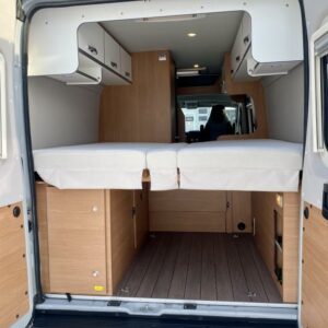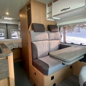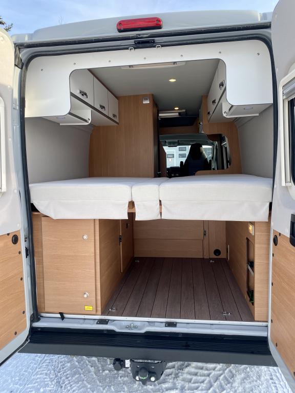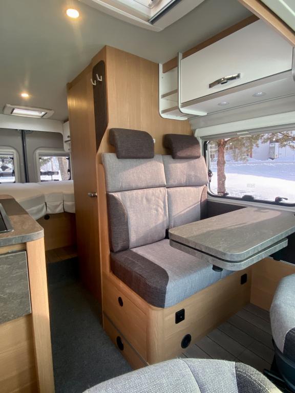 Auton takaosassa pitkittäiset erillisvuoteet ja tavaratila, edessä valoisa pöytäryhmä neljälle.