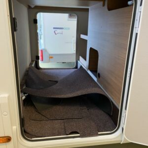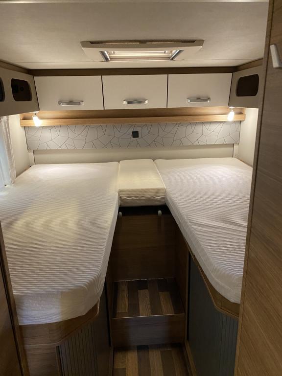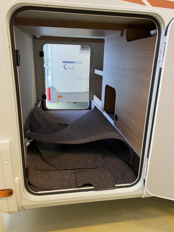 Takana erillisvuoteet ja alla tilava lämmitetty talli molemminpuoleisin luukuin, keskellä keittiö isolla jääkaapilla ja pesuhuone, edessä istuinryhmä 4:lle kääntyvin ohjaamon penkein.