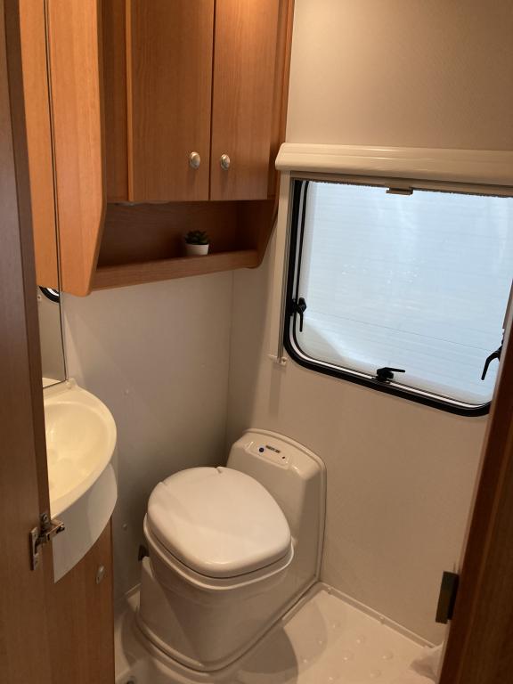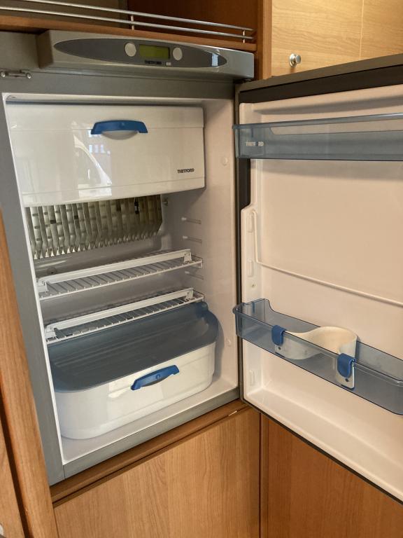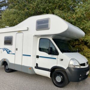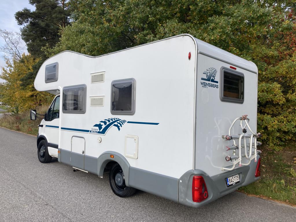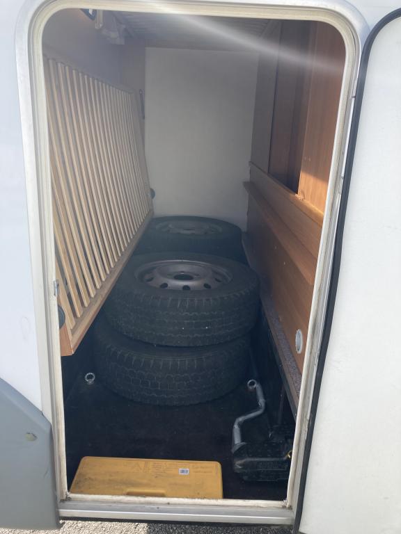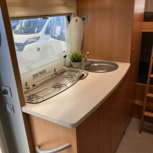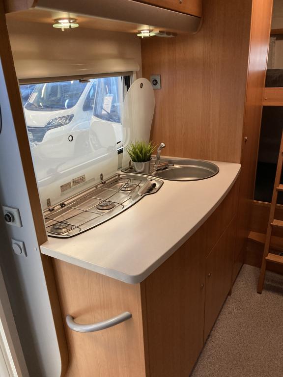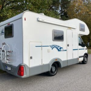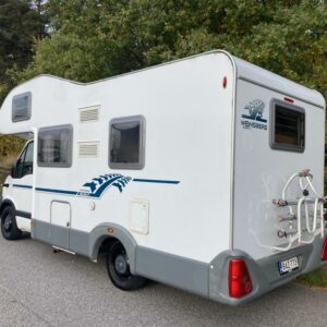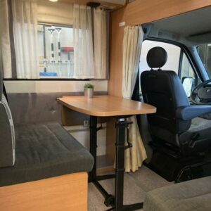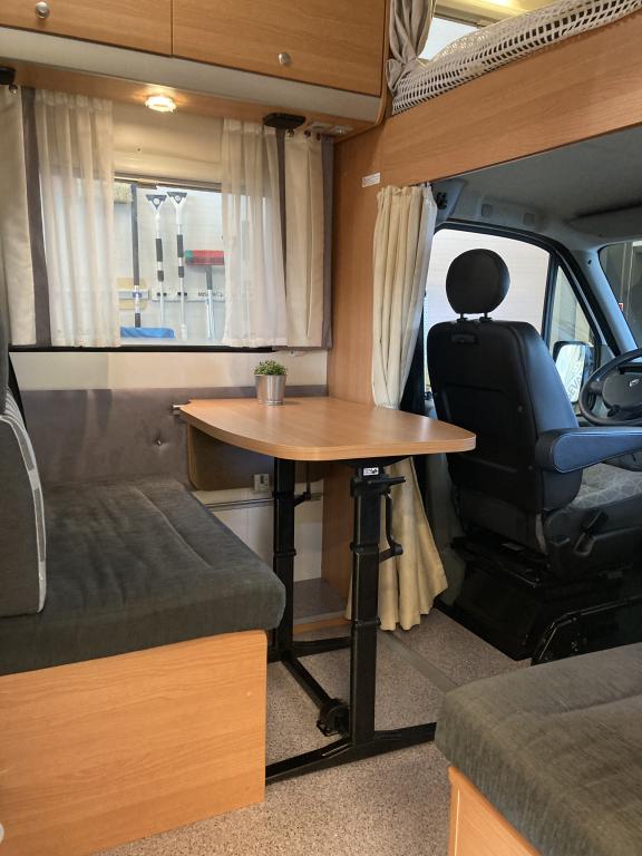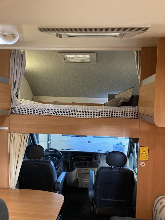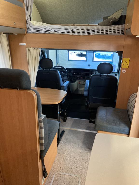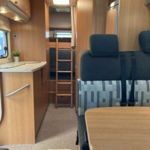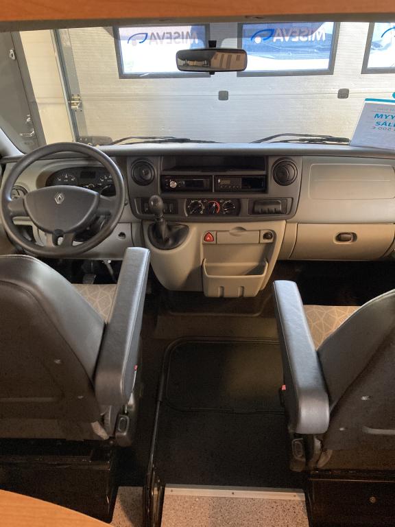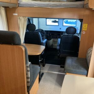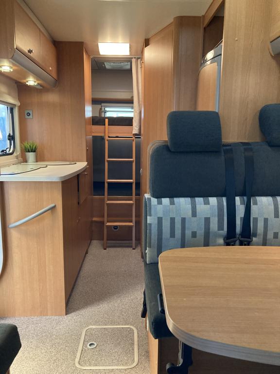 Takana kerrosvuoteet josta alemman saa nostettua ylös jollonka saadaan suurempi tavaratila. Keskellä tilava pesuhuone, vastapäätä keittiö. Edessä pöytäryhmä kääntyvin ohjaamopenkein. Ohjaamon päällä vuode kahdelle.