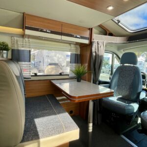 Auton etuosassa on viihtyisä pöytäryhmä, johon valoa tuo iso panoraamaikkuna. Kääntyvien etuistuinten ja sivusohvan ansiosta pöydän ympärille mahtuu mukavasti kuusi henkeä ruokailemaan ja seuraavaa kohdetta pohtimaan.
