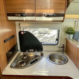 Keskeltä autoa löytyy keittiö, jonka varustukseen kuuluu iso jääkaappi erillisellä pakastinlokerolla.