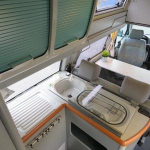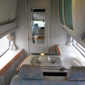 Rekisteröity 4:lle, makuupaikat 4:lle. Toinen parivuode löytyy auton kattokorotuksesta, toinen muodostuu käden käänteessä istuinryhmästä. Auton takaosassa keittiö jääkaapilla ja liedellä varustettuna.