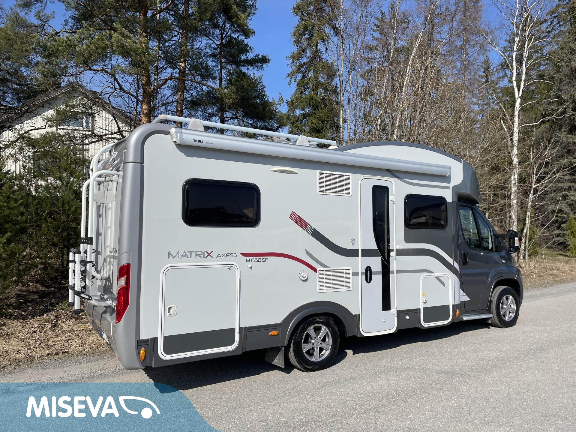 Adria Matrix 650 SF Edition 2,3 (Fiat 130 HV) Parivuode pitkittäin. Laskuvuode sähkötoiminen. Rekisteröity 5:lle. Nähtävänä Turun messuilla