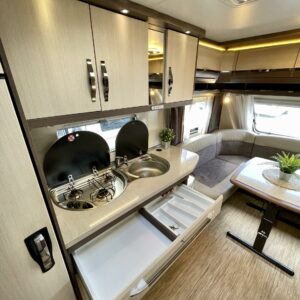 Alde, Jääkaappi, Kasetti WC, Kasettiverhot, Kattoluukku, Lattialämmitys, Liesi, Lämminvesiboileri, Nestekiertolämmitys, Pakastelokero, Parivuode, Pesuallas, Sähköpatruuna, TV-antenni tai lautasantenni, Tukijalat, Lattialämmitys (sähkö), kwh-mittari, jenkkijääkaappi, sähkön ulosotto, televisioteline, Asuinosan hyttysovi/verho