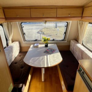 Lattialämmitys (sähkö), Jääkaappi, Kasetti WC, Kasettiverhot, Kattoluukku, Liesi, Pakastelokero, Parivuode, Pesuallas, Takakeittiö, Tukijalat