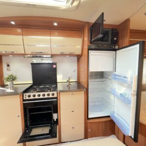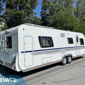 Alde, Insulated grey water tank, Ilmastointi: Automaattinen, Fridge, Gas oven, Cassette WC, Cassette blinds, Roof hatch, Bunk bed, Floor heating, Passenger area carpets, Stove, Hot water boiler, Microwave oven, Fluid circulation heating, Freezer compartment, Double bed, Sink, Bicycle rack, Shower, Electric heating cartridge, TV-antenni tai lautasantenni, Support legs, Lattialämmitys (nestekierto), Ilmastointi (asuintila), mover, jenkkijääkaappi, liesituuletin, televisioteline, Asuinosan hyttysovi/verho