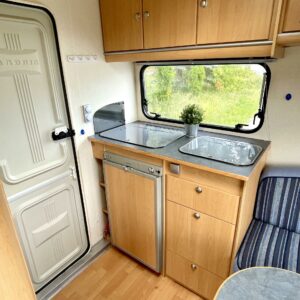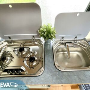 Front tent, Fridge, Cassette WC, Roof hatch, Stove, Sun shade, Sink, Rear kitchen, Trumatic, Support legs, Solar panel