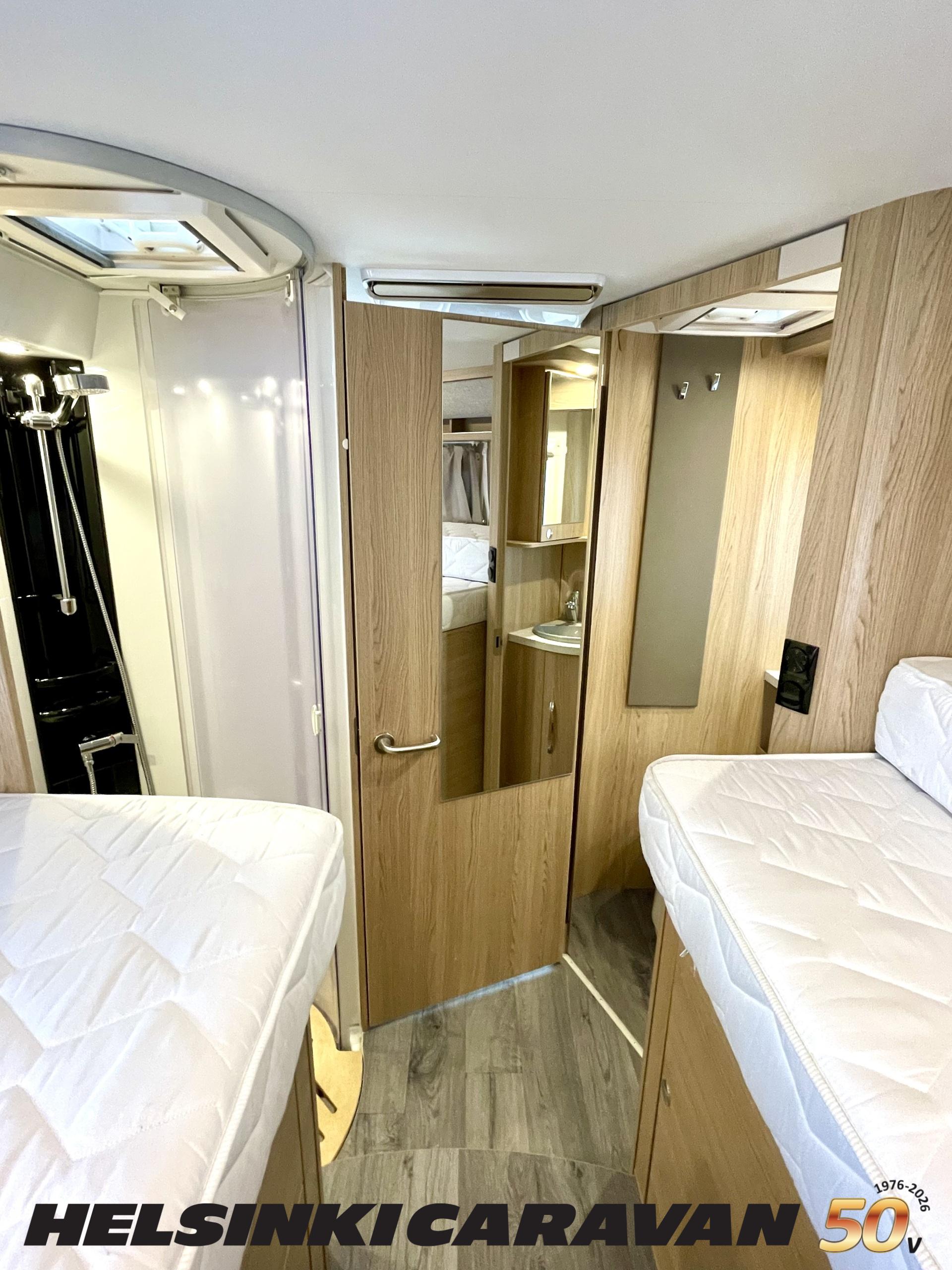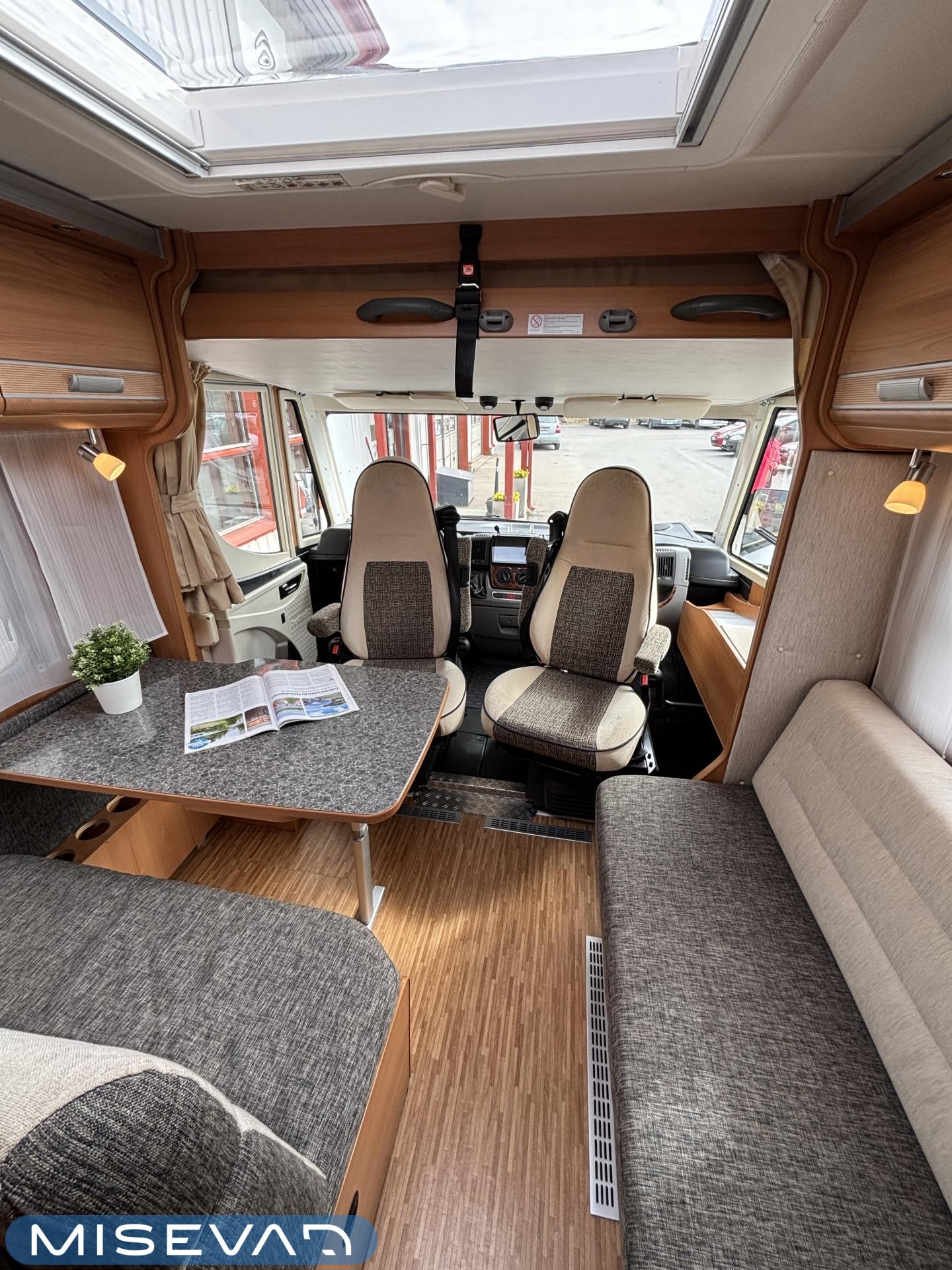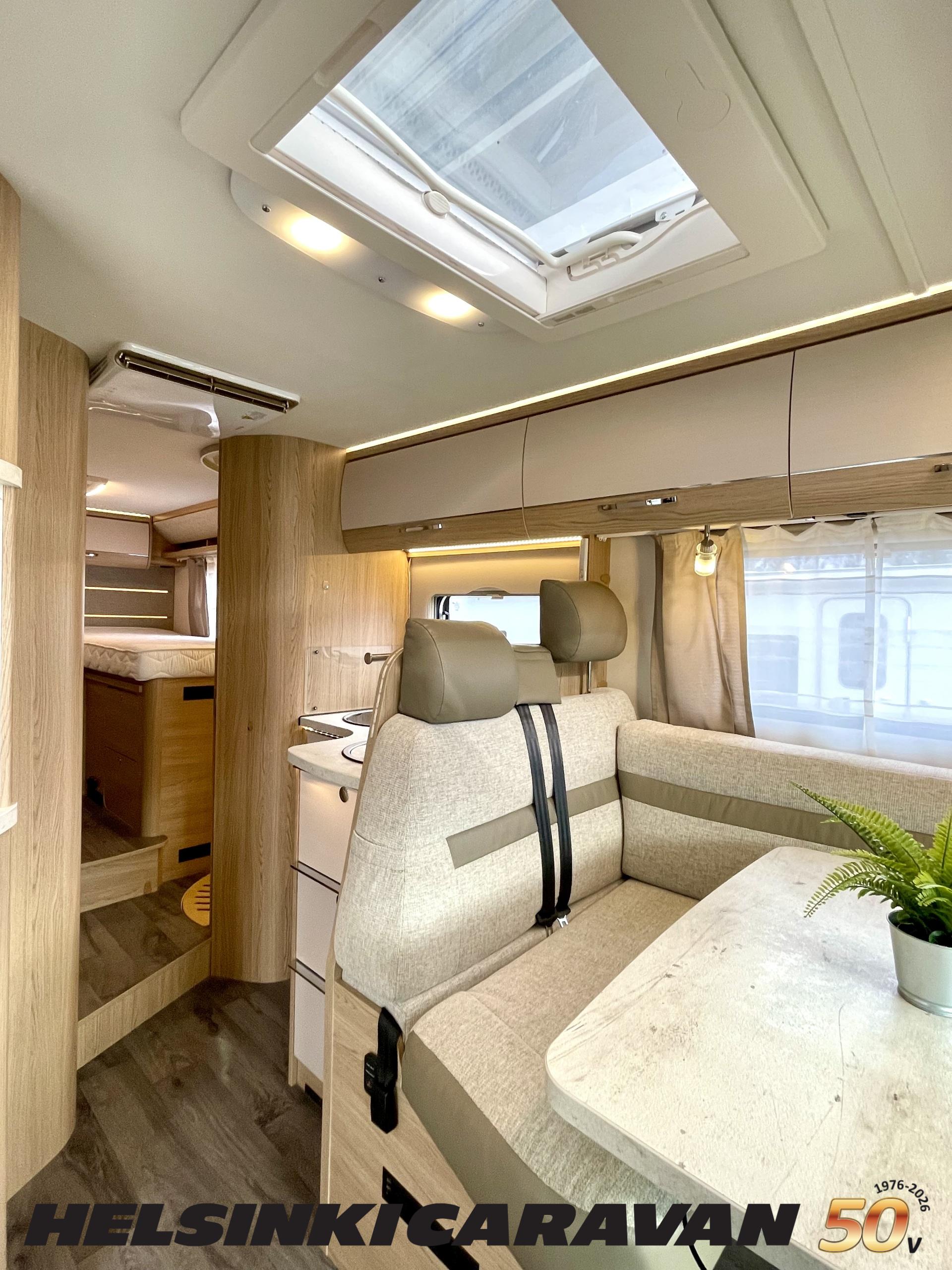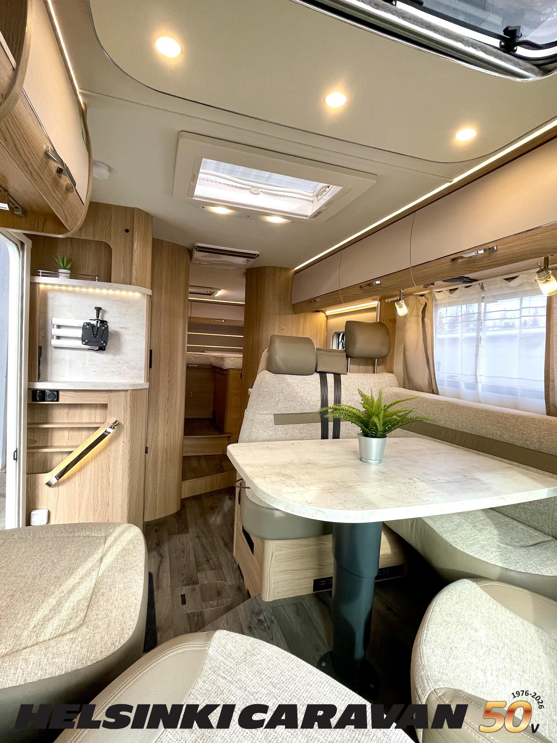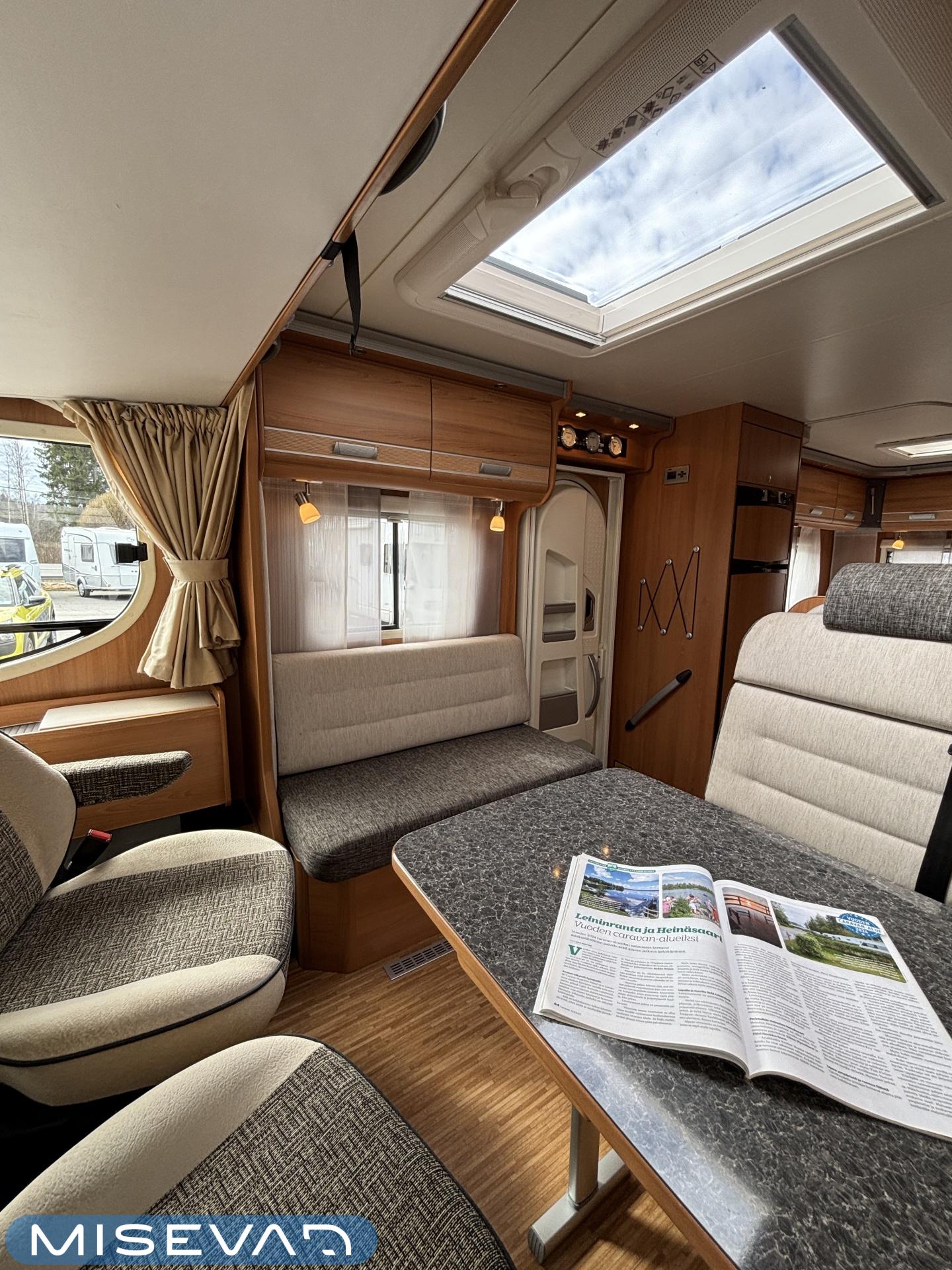 ABS brakes, Airbag, Ilmastointi: Manuaalinen, Fridge, Cassette WC, Cassette blinds, Roof hatch, Keskuslukitus: Kaukosäätöinen, Ignition interlock, Passenger area carpets, Stove, Hot water boiler, Navigator, Power steering, Freezer compartment, Double bed, Sink, Radio, Shower, Electric windows, Electric heating cartridge, Power side mirrors, Electric steps, Trumatic, Turbo, Vakionopeudensäädin, harmaavesisäiliön lämmitys, ohjaamon kasettiverhot, Asuinosan hyttysovi/verho, Cab air conditioning