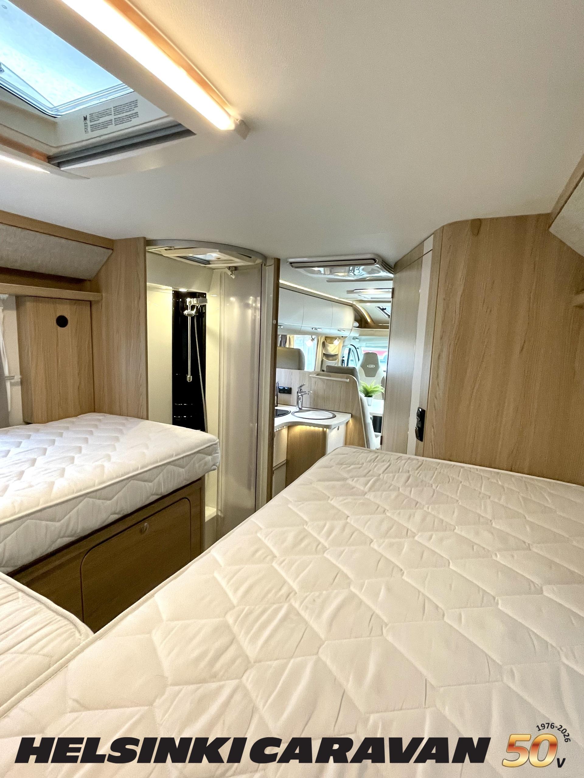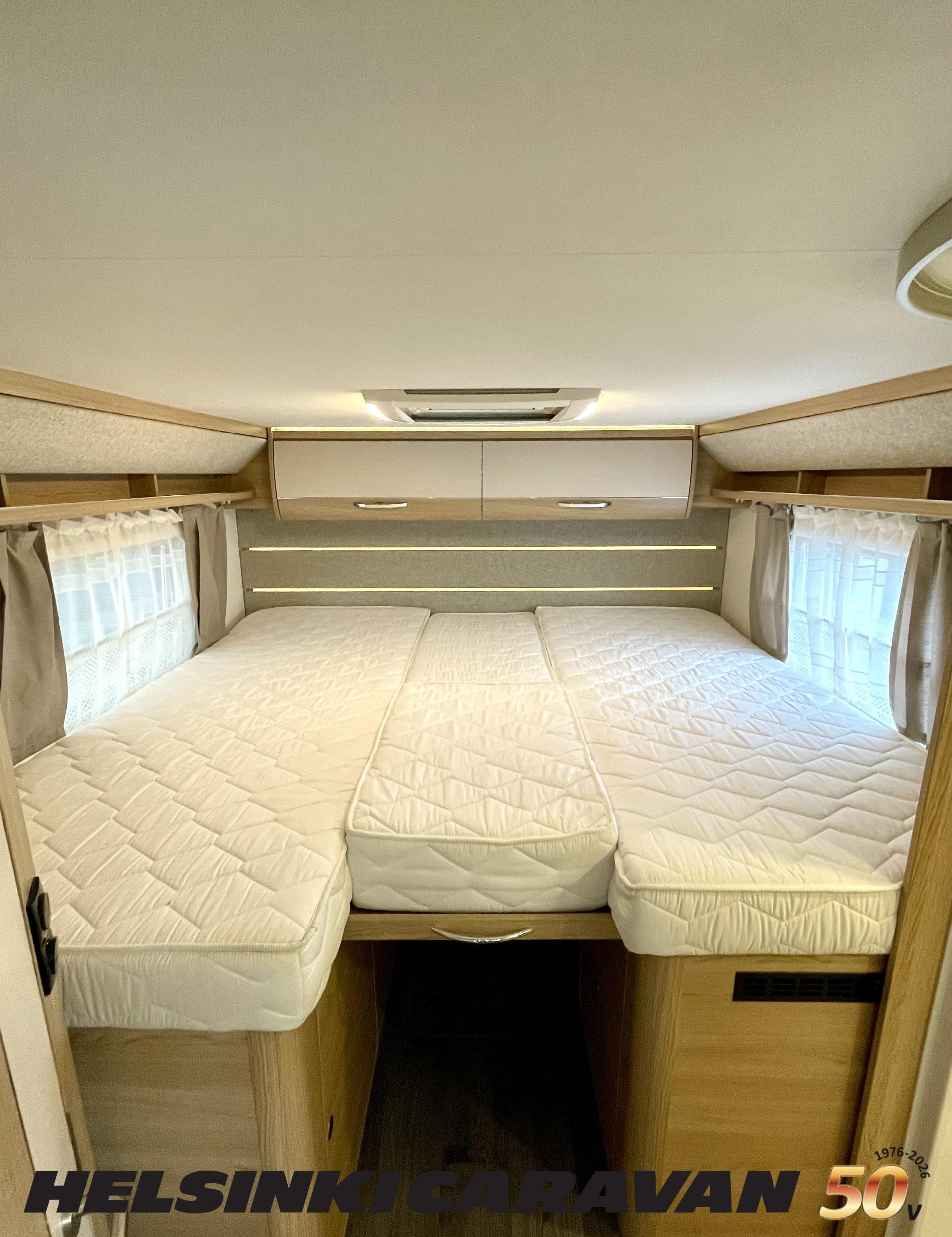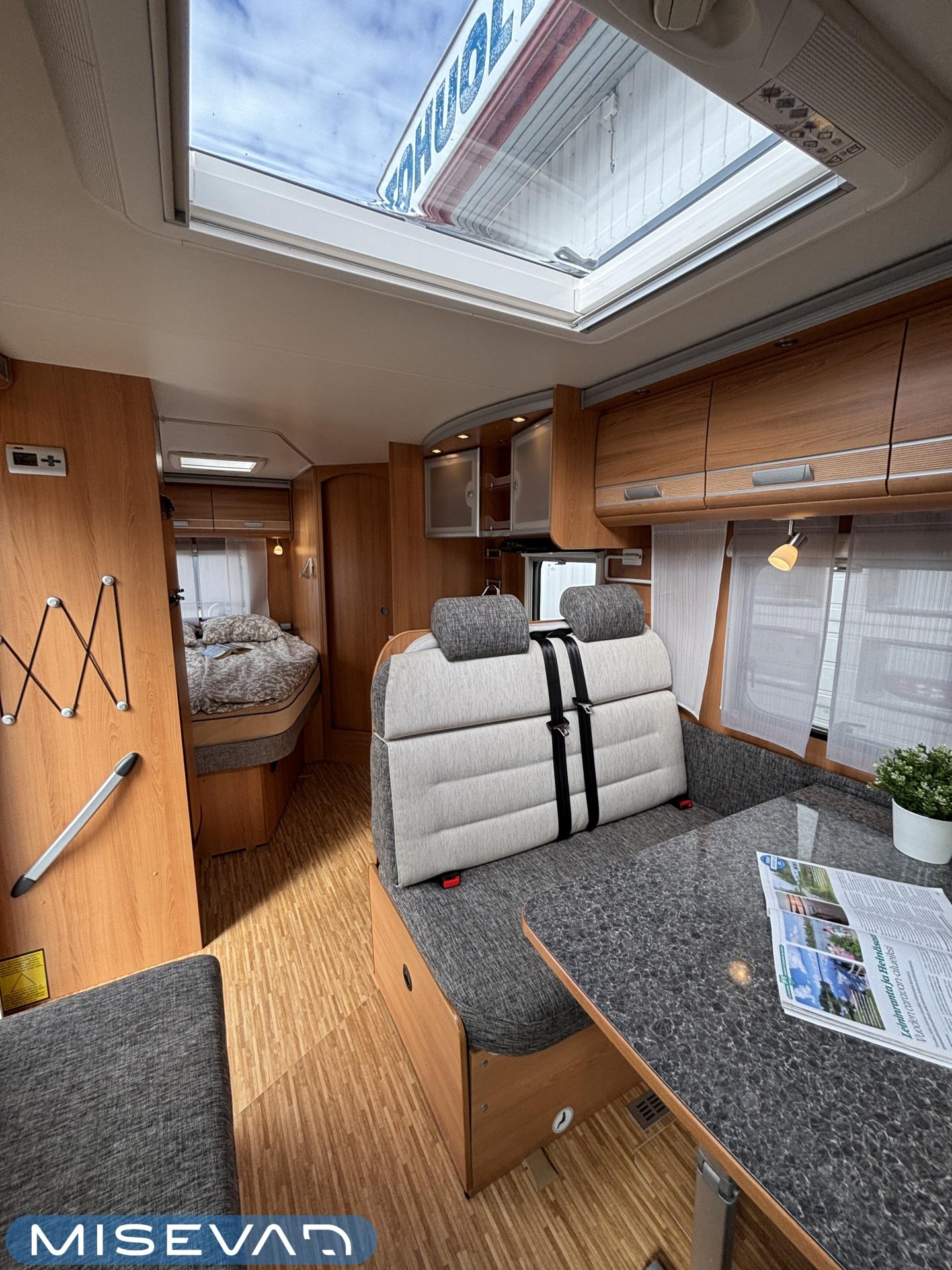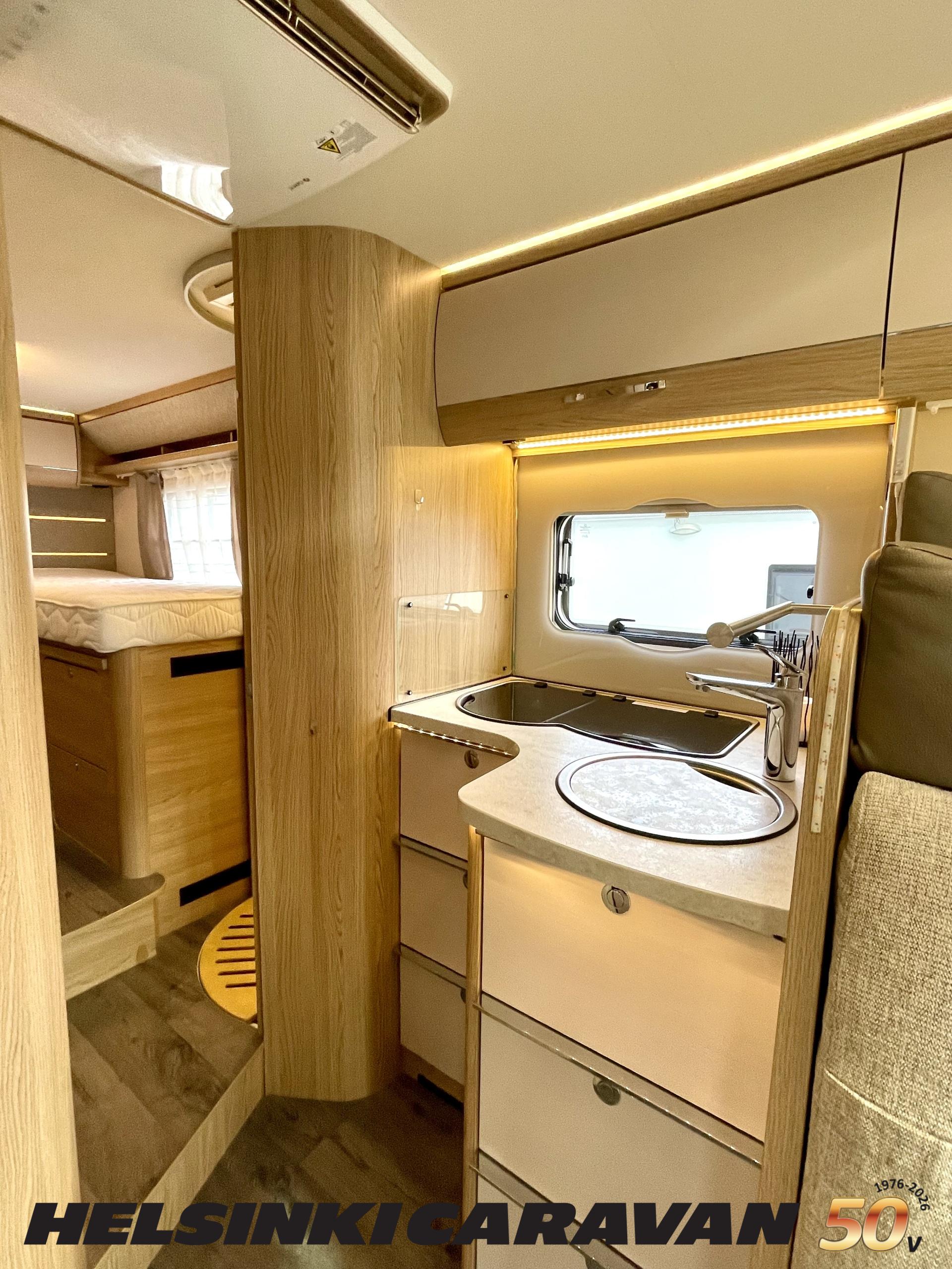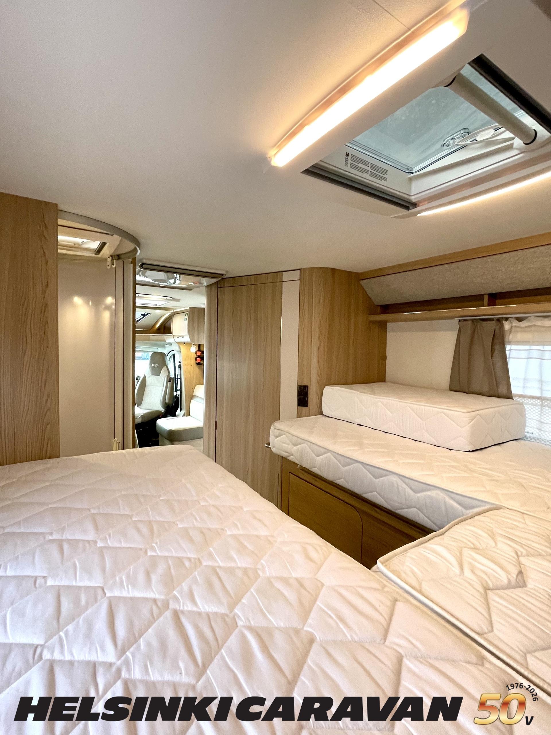 ABS brakes, Airbag, Ilmastointi: Manuaalinen, Fridge, Cassette WC, Cassette blinds, Roof hatch, Keskuslukitus: Kaukosäätöinen, Ignition interlock, Passenger area carpets, Stove, Hot water boiler, Navigator, Power steering, Freezer compartment, Double bed, Sink, Radio, Shower, Electric windows, Electric heating cartridge, Power side mirrors, Electric steps, Trumatic, Turbo, Vakionopeudensäädin, harmaavesisäiliön lämmitys, ohjaamon kasettiverhot, Asuinosan hyttysovi/verho, Cab air conditioning