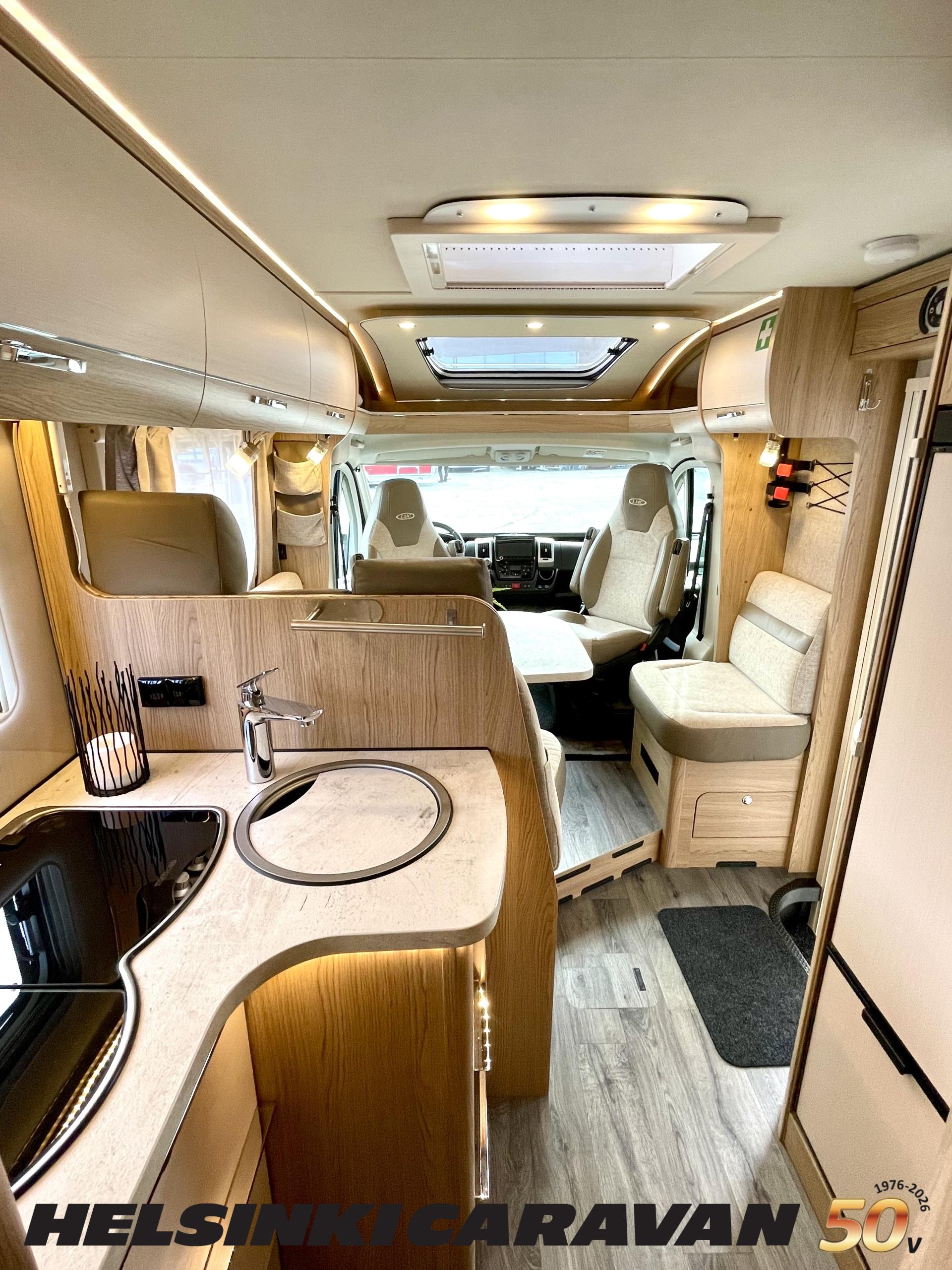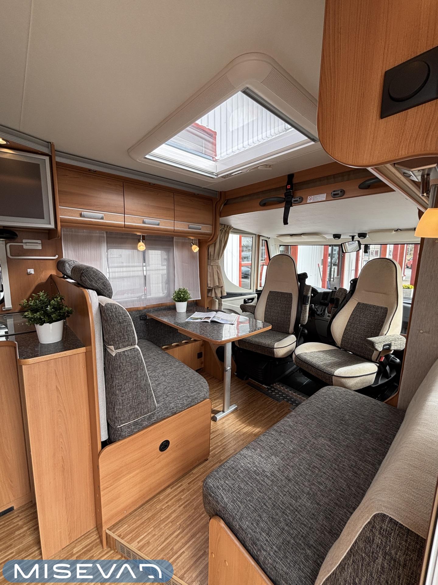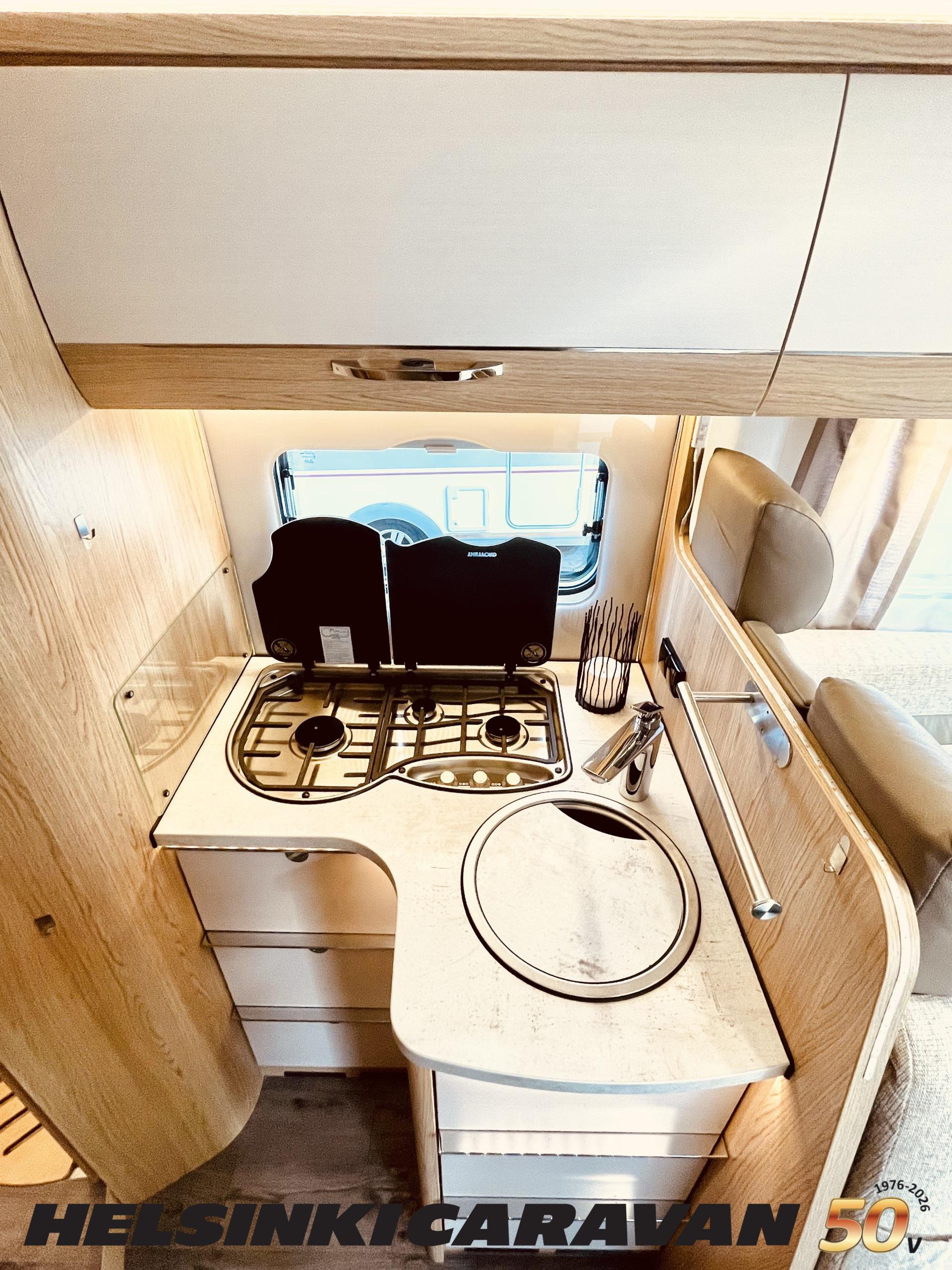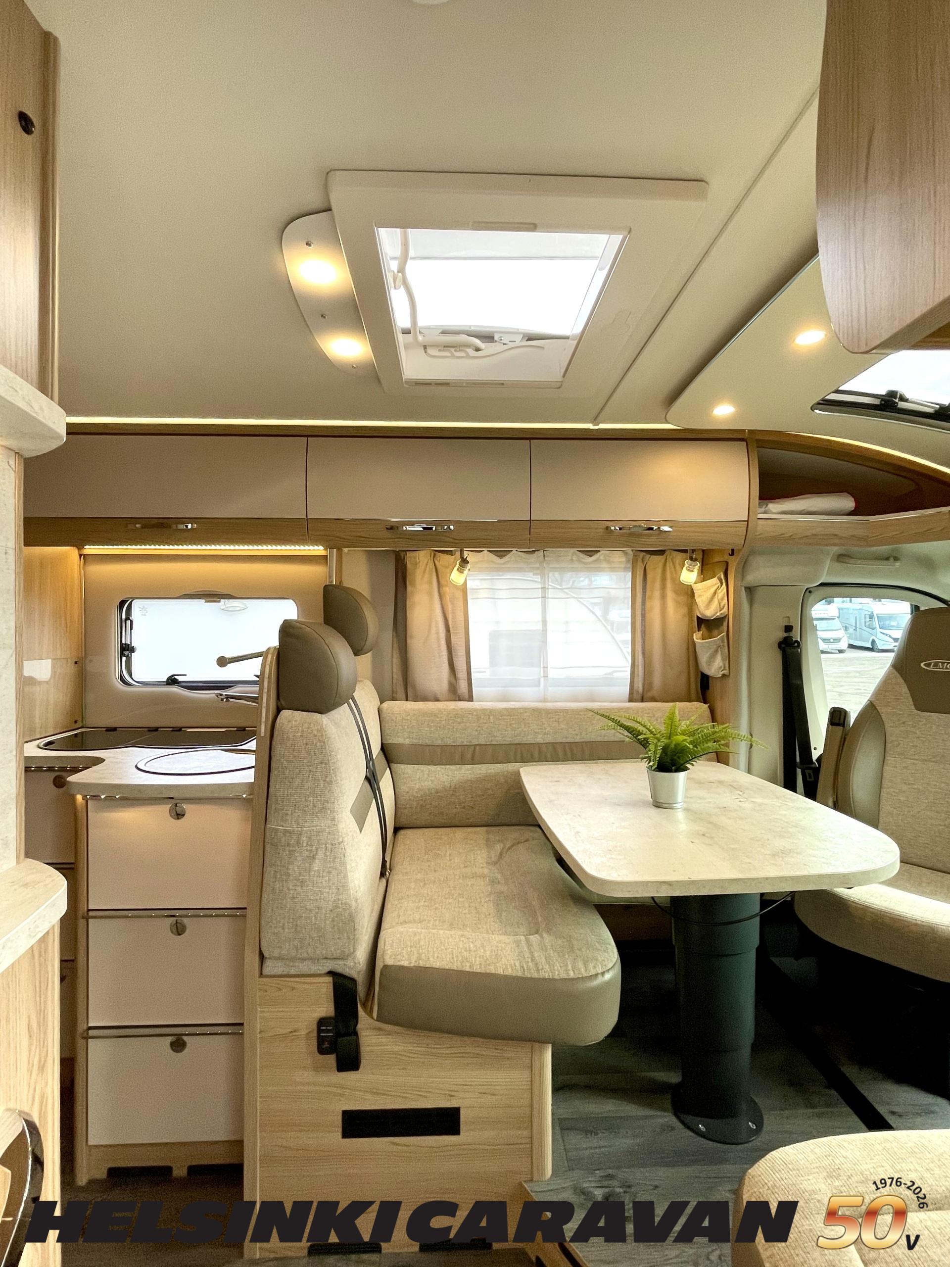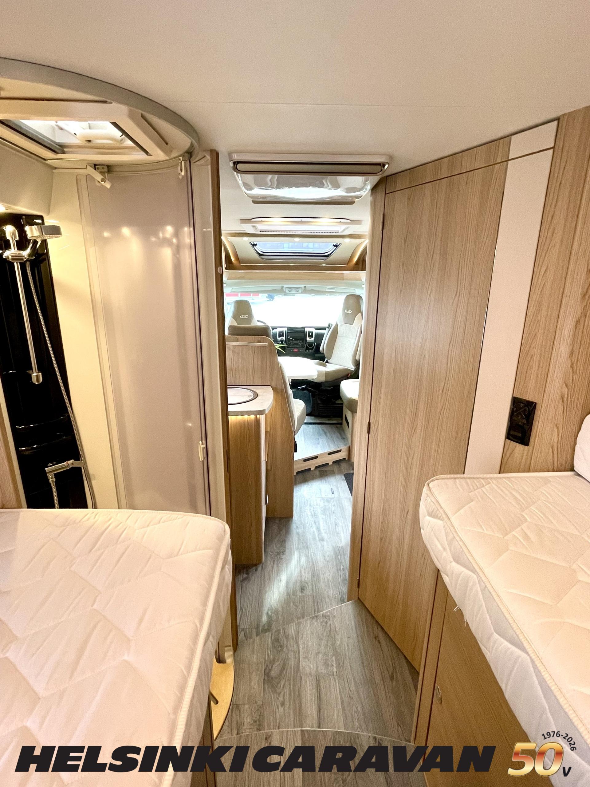 ABS brakes, Airbag, Ilmastointi: Manuaalinen, Fridge, Cassette WC, Cassette blinds, Roof hatch, Keskuslukitus: Kaukosäätöinen, Ignition interlock, Passenger area carpets, Stove, Hot water boiler, Navigator, Power steering, Freezer compartment, Double bed, Sink, Radio, Shower, Electric windows, Electric heating cartridge, Power side mirrors, Electric steps, Trumatic, Turbo, Vakionopeudensäädin, harmaavesisäiliön lämmitys, ohjaamon kasettiverhot, Asuinosan hyttysovi/verho, Cab air conditioning