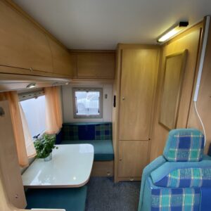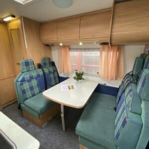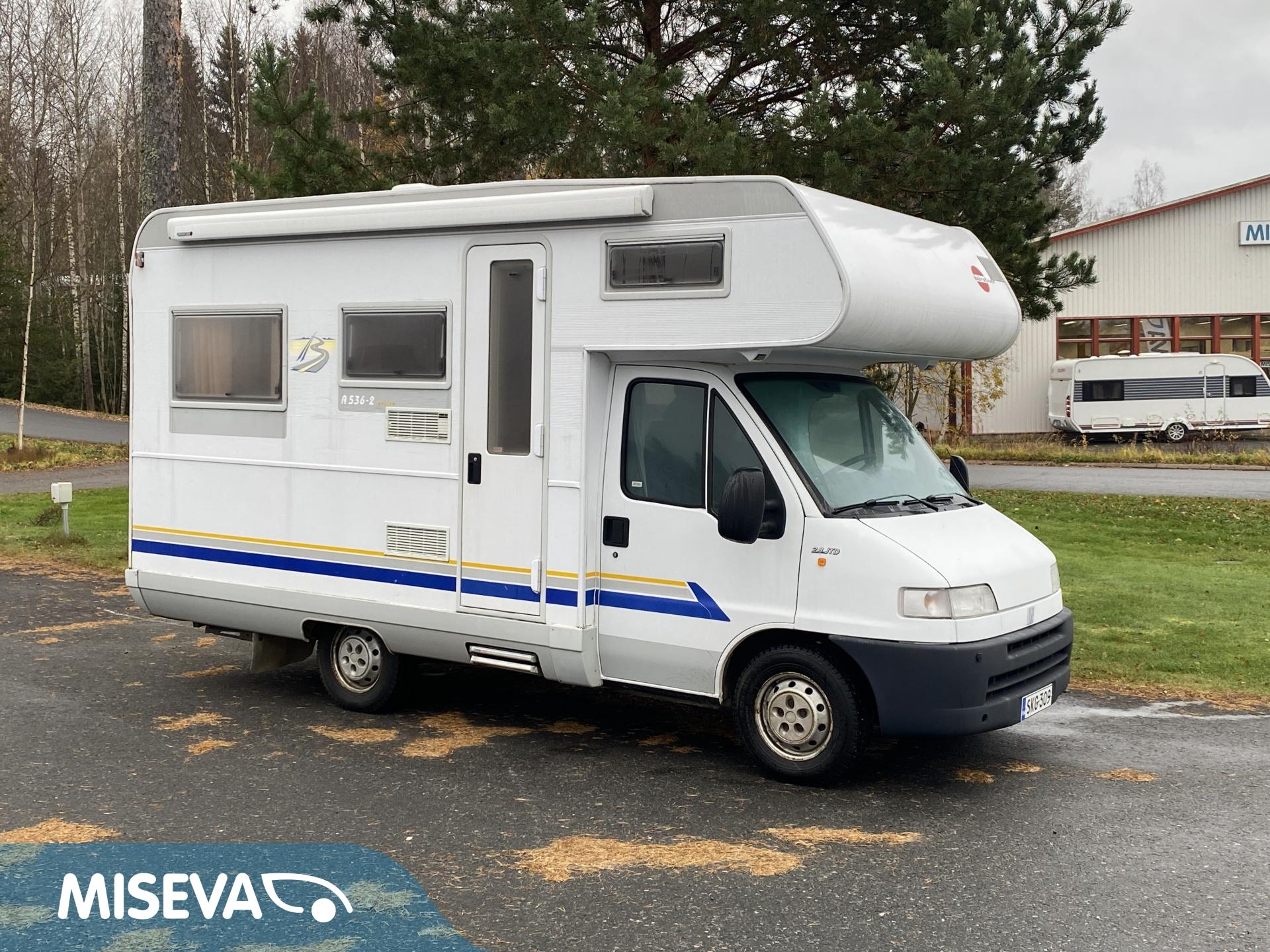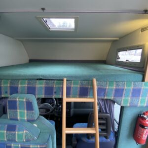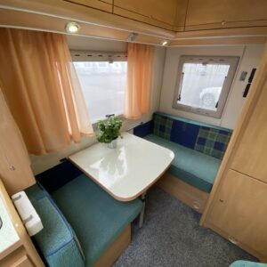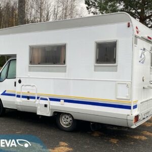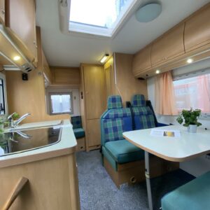 Double bottom, Fridge, Cassette WC, Sun shade, Radio, Power steering, Freezer compartment, Electric steps, Bicycle rack, Roof hatch, Central heating, Stove, Engine heater, Hot water boiler, Sink, Trumatic