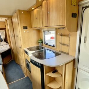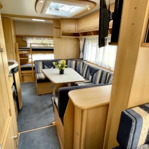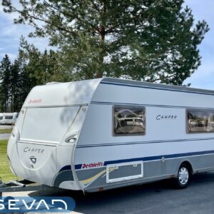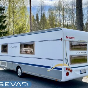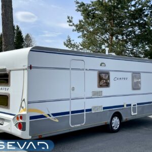 Alde, Electric heating cartridge, Lattialämmitys (sähkö), Support legs, Double bed, Sink, Stove, Fridge, Freezer compartment, Cassette WC, Cassette blinds