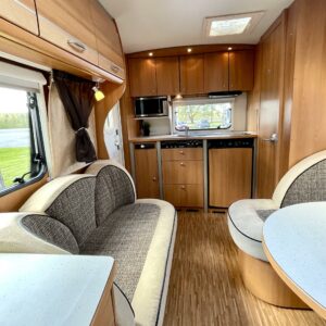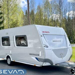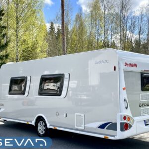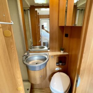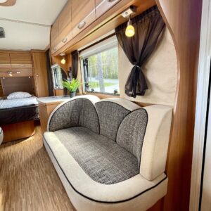 Alde, Electric heating cartridge, Lattialämmitys (sähkö), kwh-mittari, Stove, Support legs, Ilmastointi (asuintila), Cassette WC, Fridge, Cassette blinds, Roof hatch, Rear kitchen, Sink, Shower, Hot water boiler, Freezer compartment, Double bed