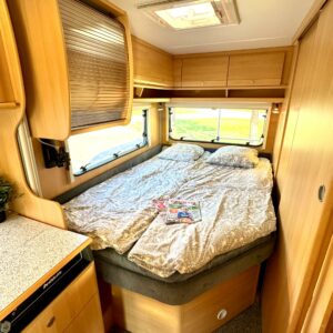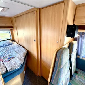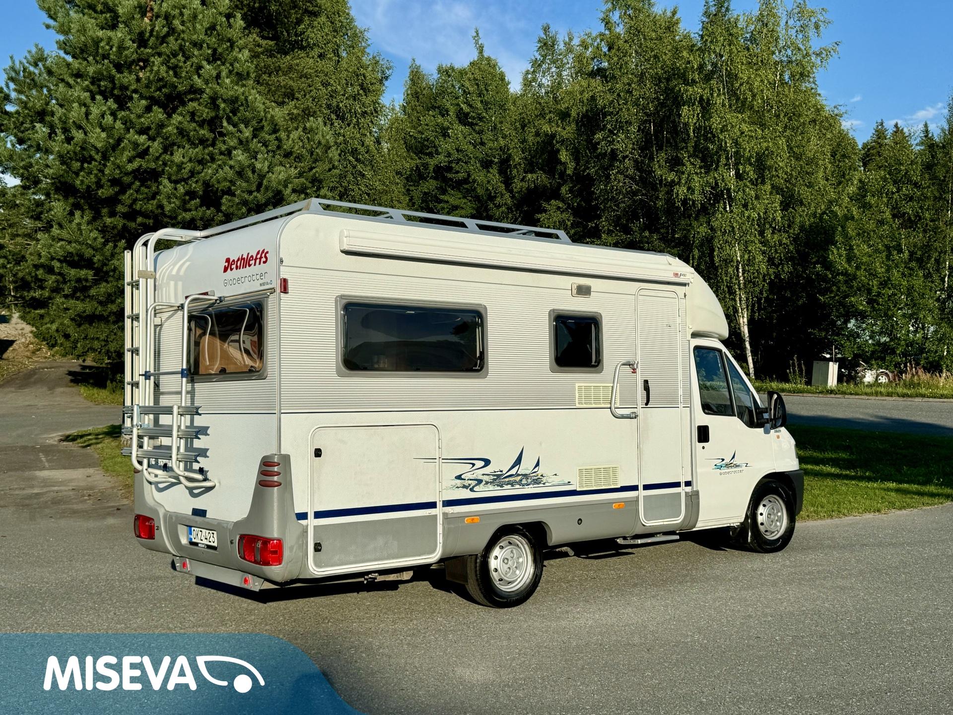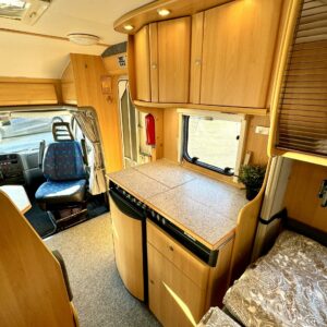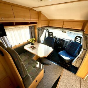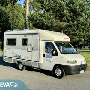 Fridge, Cassette WC, Cassette blinds, Roof railing/ladder, Roof hatch, Central heating, Passenger area carpets, Stove, Hot water boiler, Sun shade, Power steering, Freezer compartment, Double bed, Sink, Bicycle rack, Radio, Shower, Trumatic, Turbo