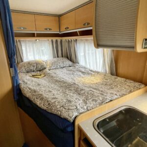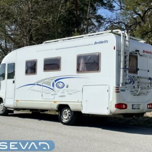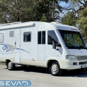 Solar panel, Fridge, Cassette WC, Cassette blinds, Roof hatch, Stove, Hot water boiler, Sun shade, Power steering, Freezer compartment, Double bed, Sink, Bicycle rack, Radio, Electric steps, Turbo, Towing hook, Cab air conditioning, Shower, Trumatic, Central heating, Kesärenkaat