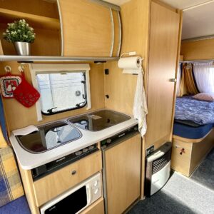 CD-soitin, Separate beds, Trumatic, Fridge, Cassette WC, Cassette blinds, Roof hatch, Stove, Hot water boiler, Sun shade, Freezer compartment, Sink, TV-antenni tai lautasantenni, Support legs, Microwave oven, kwh-mittari