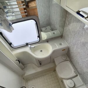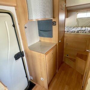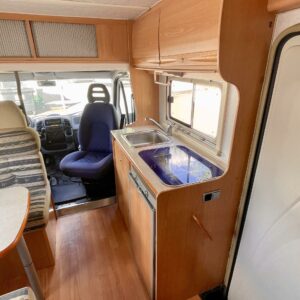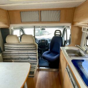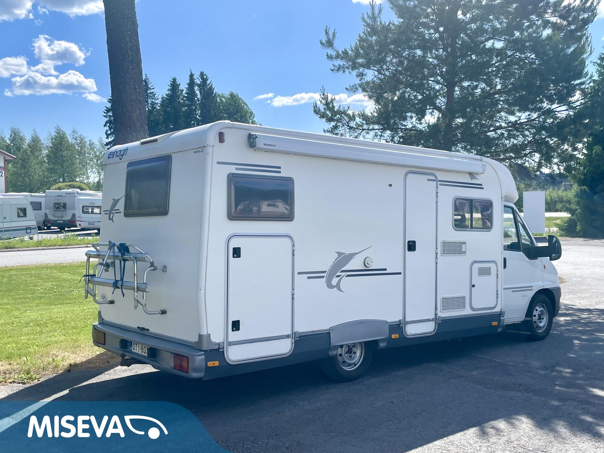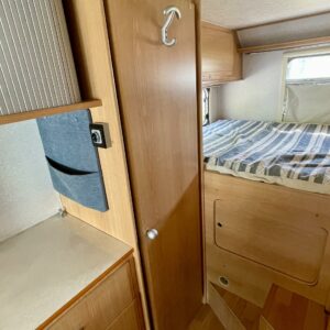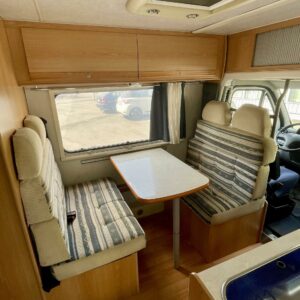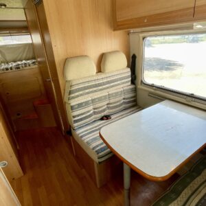 Fridge, Cassette WC, Cassette blinds, Roof hatch, Central heating, Ignition interlock, Stove, Engine heater, Hot water boiler, Sun shade, Power steering, Freezer compartment, Double bed, Sink, Bicycle rack, Trumatic, Turbo