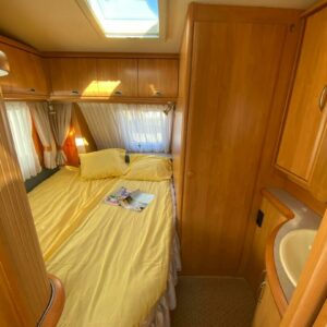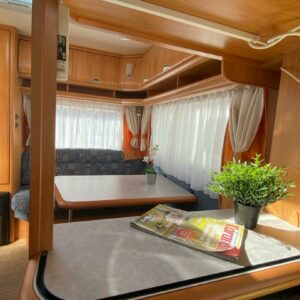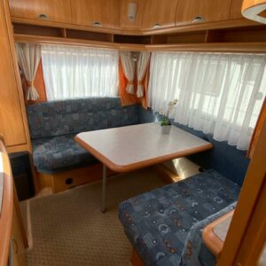 Fridge, Cassette WC, Cassette blinds, Roof hatch, Roof railing/ladder, Passenger area carpets, Stove, Hot water boiler, Sun shade, Freezer compartment, Sink, Shower, Trumatic, Support legs, Kesärenkaat, kwh-mittari, Asuinosan hyttysovi/verho