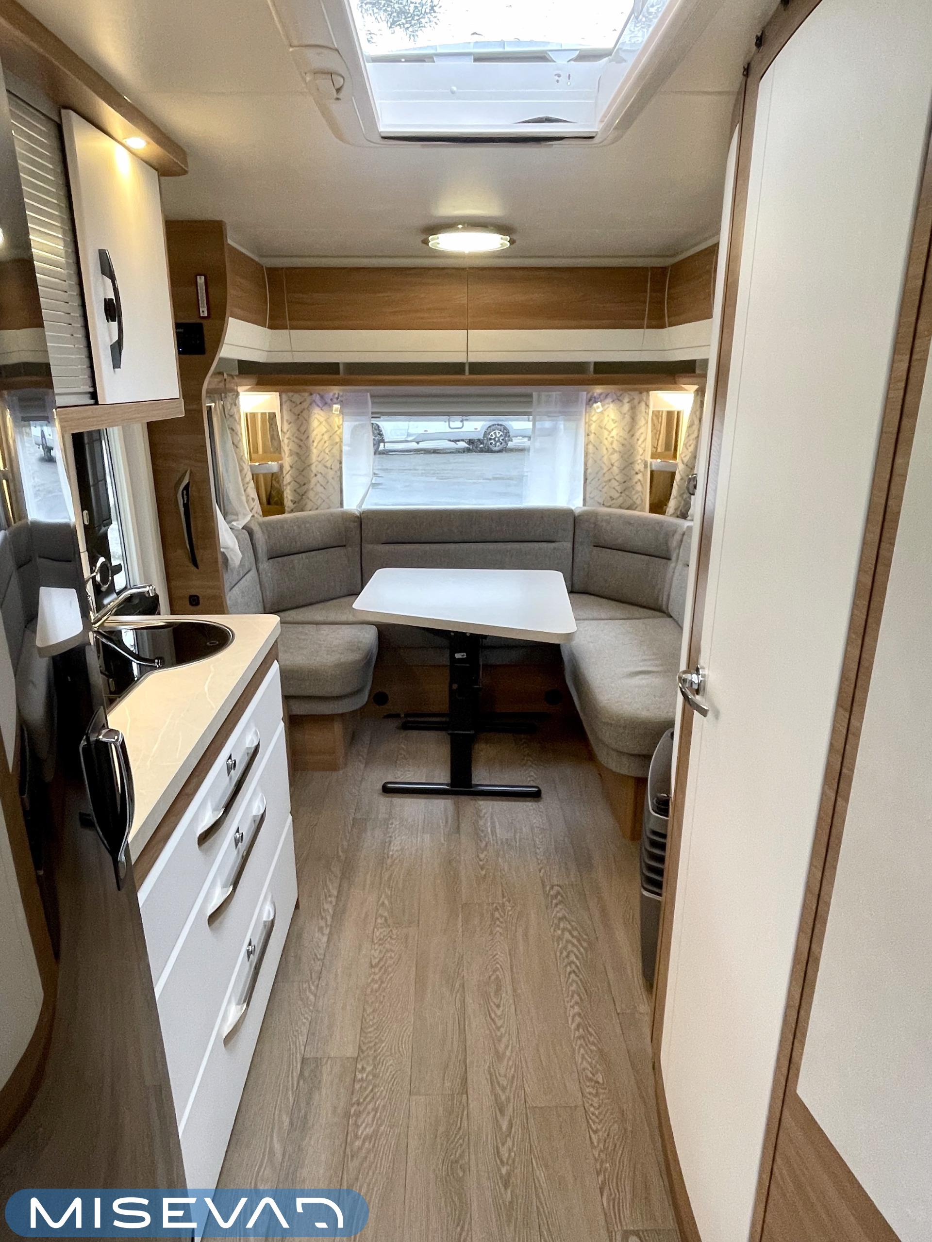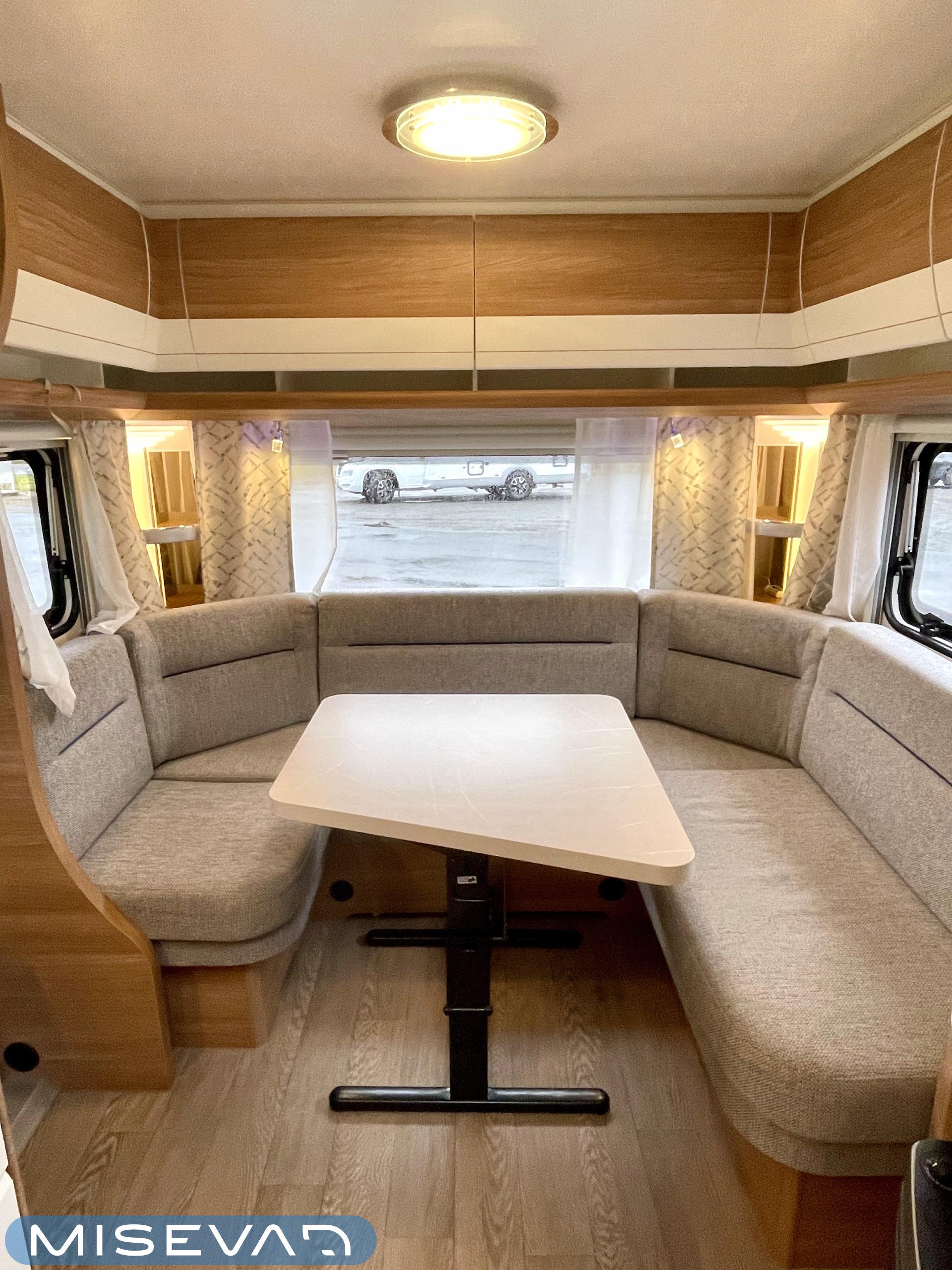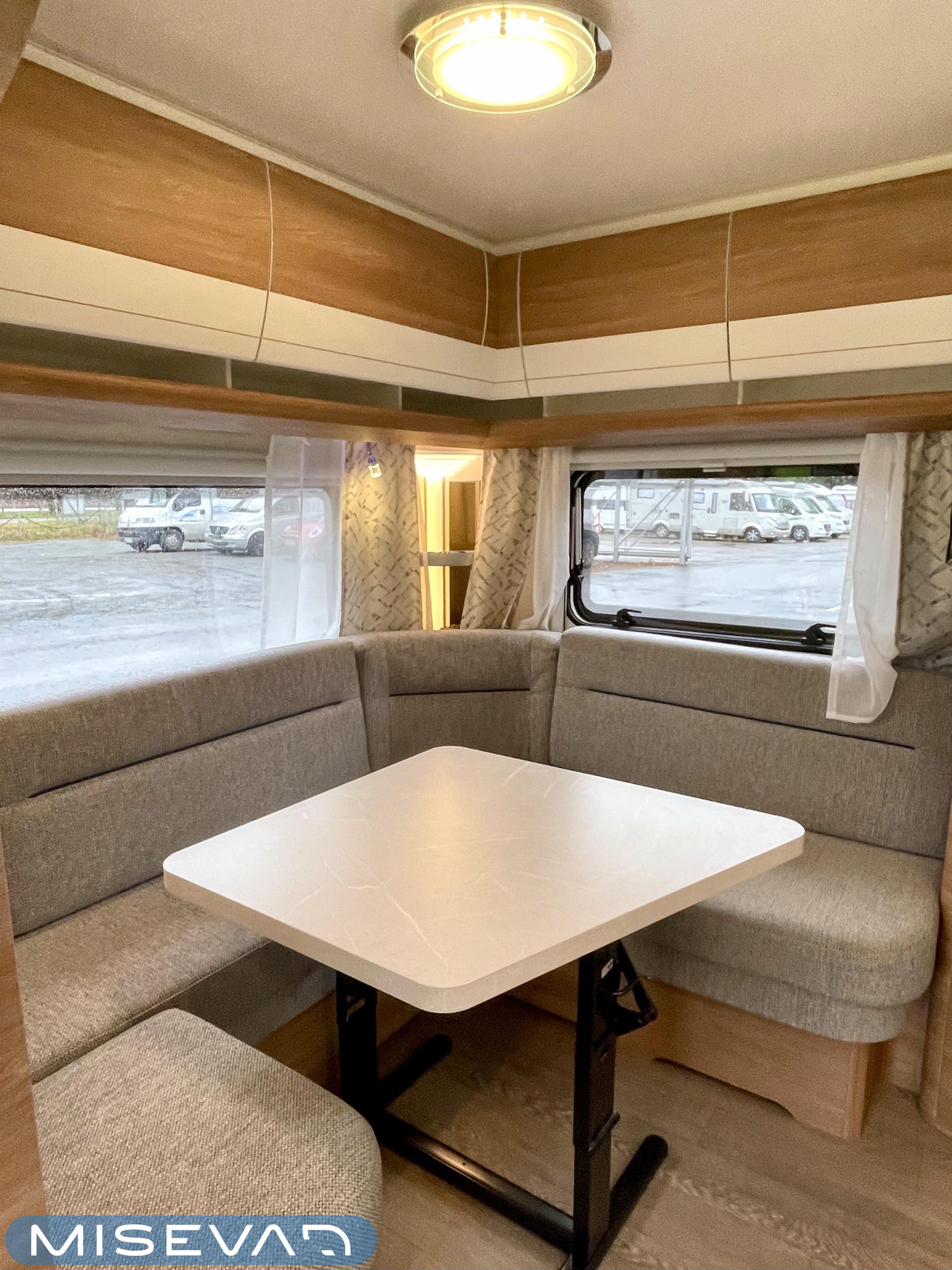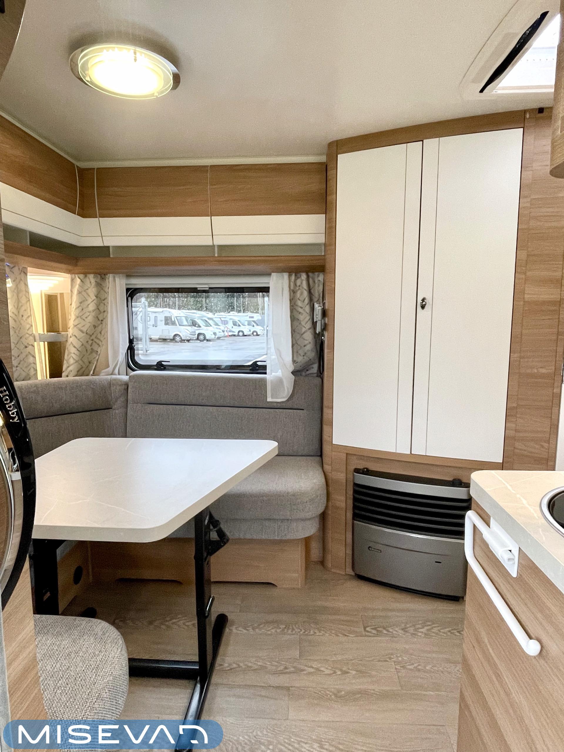 Solar panel, Fridge, Cassette WC, Cassette blinds, Roof hatch, Floor heating, Stove, Sink, Double bed, Freezer compartment, Sun shade, Hot water boiler, TV-antenni tai lautasantenni, Trumatic, Support legs