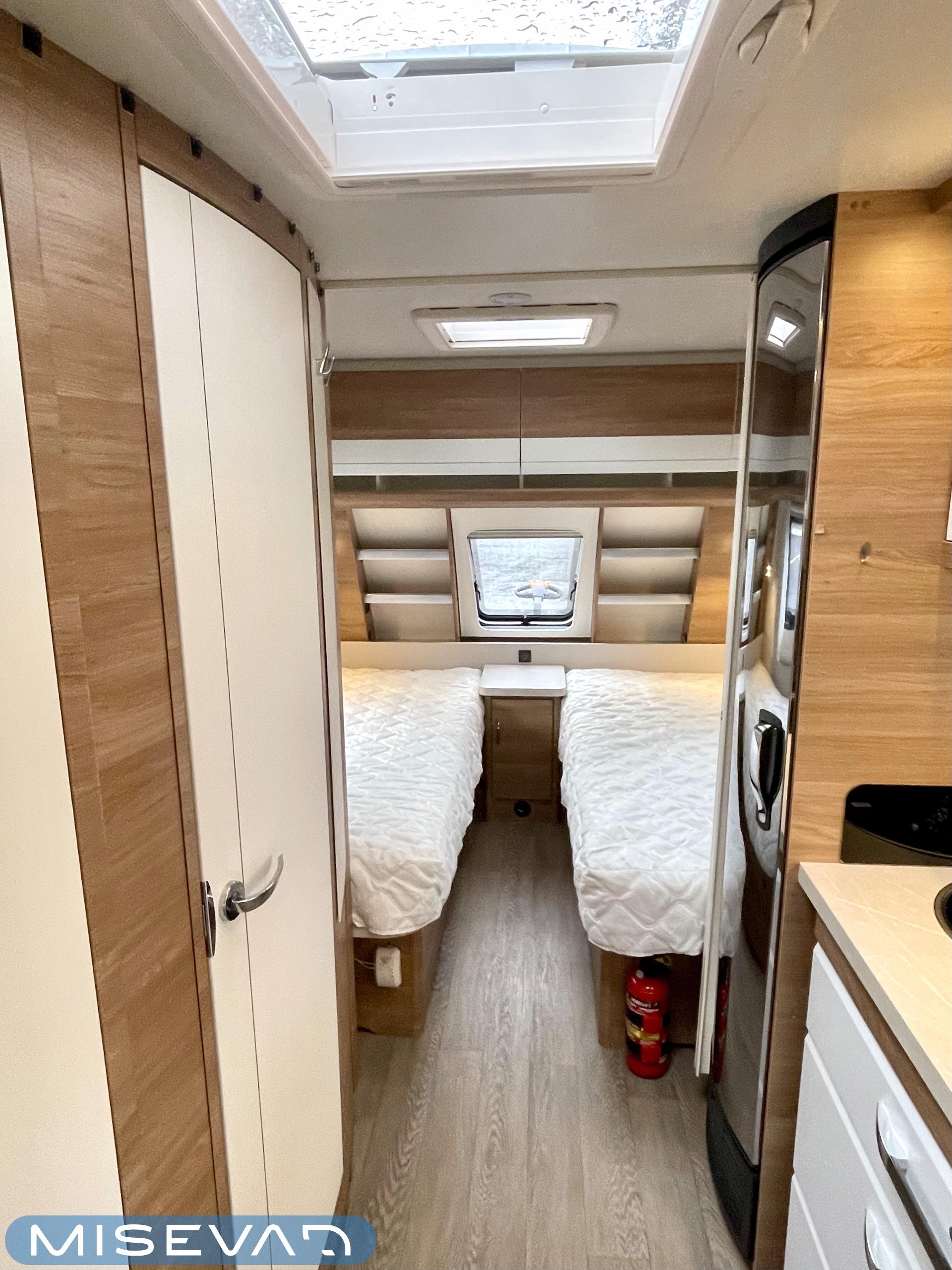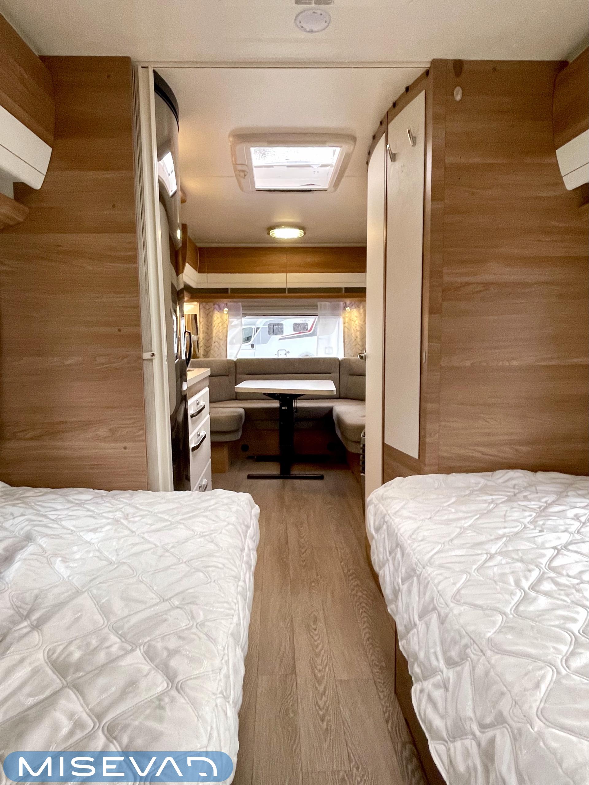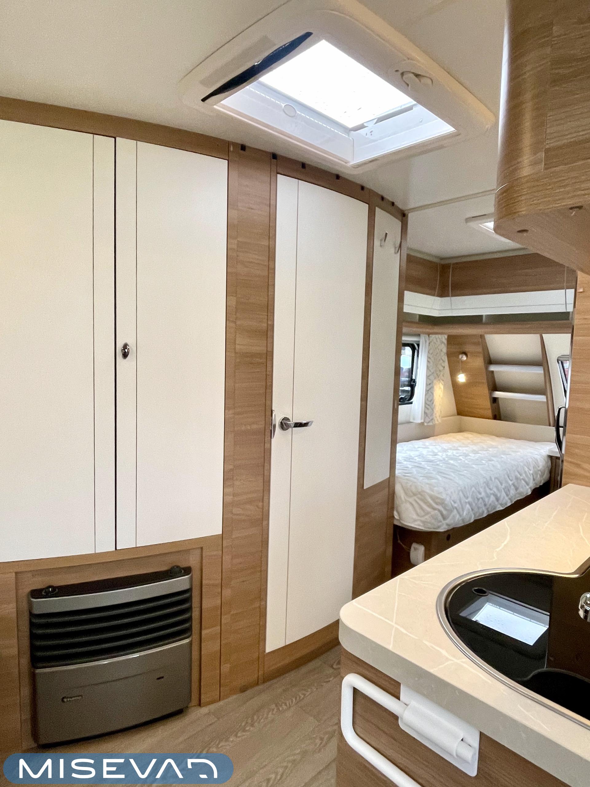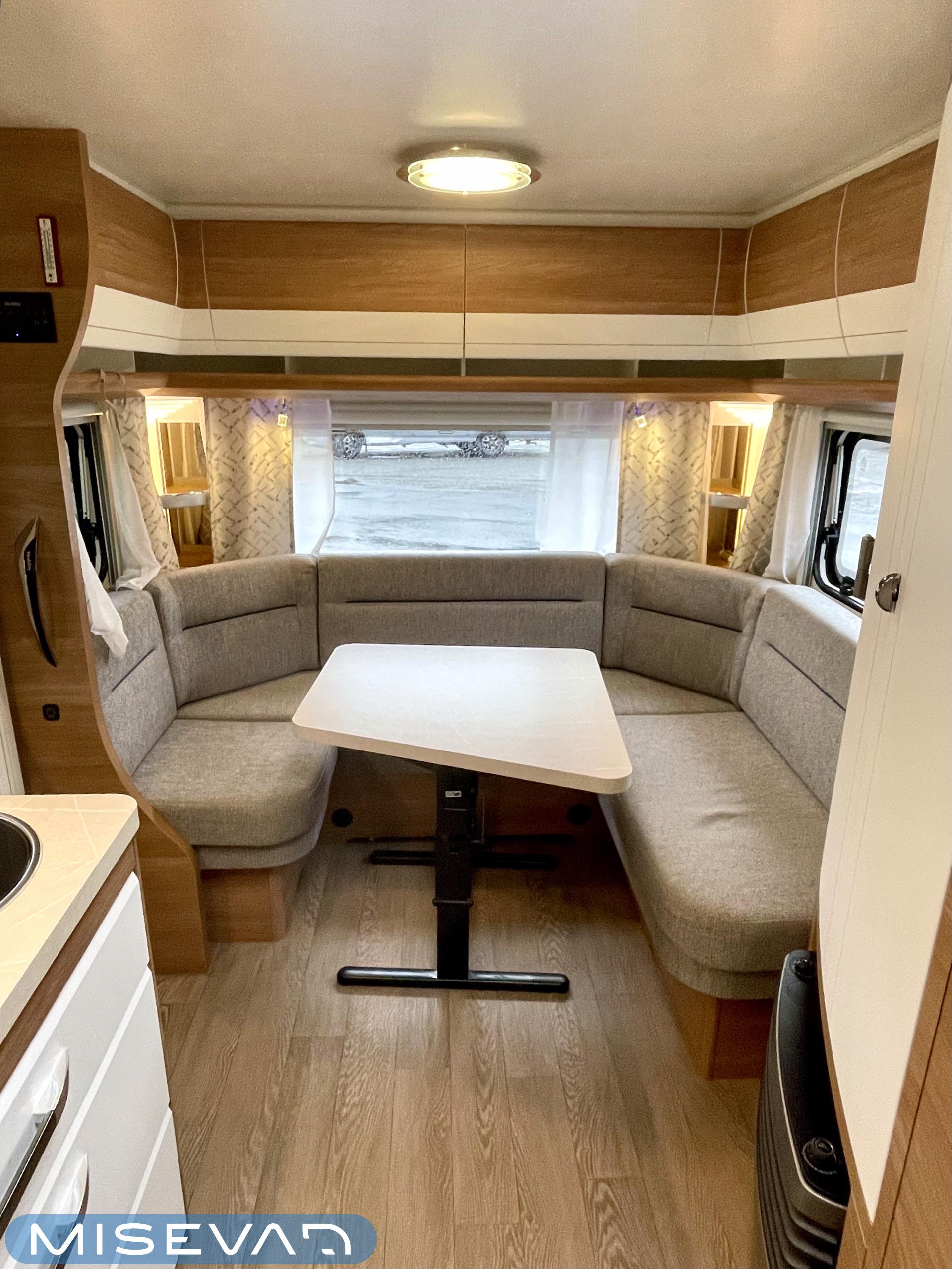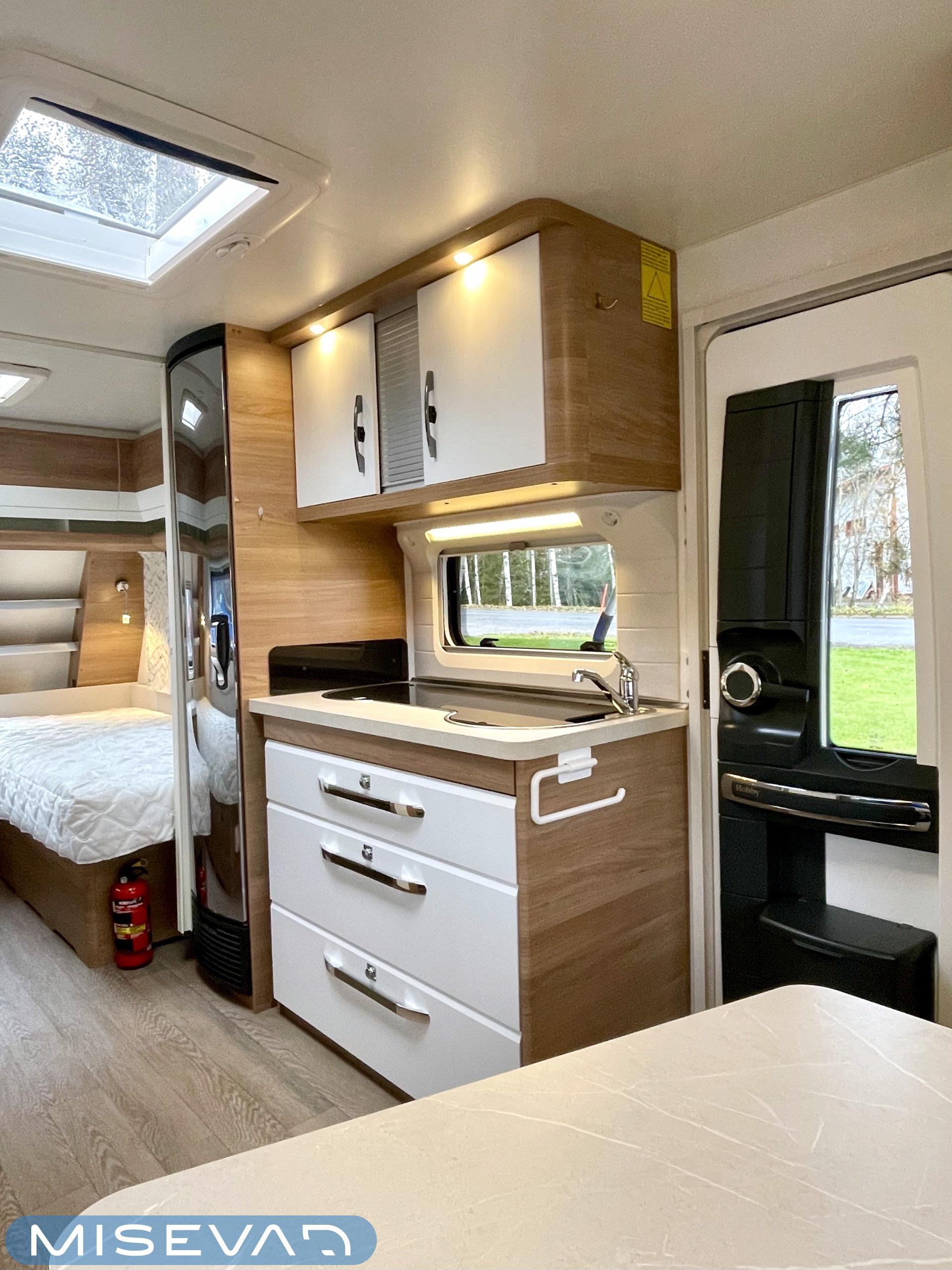 Solar panel, Fridge, Cassette WC, Cassette blinds, Roof hatch, Floor heating, Stove, Sink, Double bed, Freezer compartment, Sun shade, Hot water boiler, TV-antenni tai lautasantenni, Trumatic, Support legs