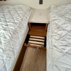 Separate beds, Fridge, Cassette WC, Cassette blinds, Floor heating, Stove, Hot water boiler, Freezer compartment, Electric heating cartridge, Trumatic, Support legs, TV antenna/satellite dish, Lattialämmitys (sähkö), jenkkijääkaappi, televisio, Asuinosan hyttysovi/verho, sähkön ulosotto, Passenger area carpets, kwh-mittari