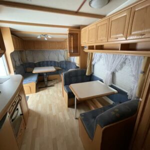 Jääkaappi,Kaasu-uuni,Kasetti WC,Kattoluukku,Lattiamatot asunto-osassa,Liesi,Nestekiertolämmitys,Pakastelokero,Parivuode,Pesuallas,Tukijalat,TV-antenni/lautasantenni