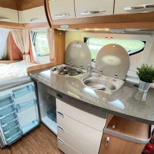 Fridge, Cassette WC, Roof hatch, Floor heating, Passenger area carpets, Hot water boiler, Stove, Double bed, Sink, Electric heating cartridge, Trumatic, Lattialämmitys (sähkö), kwh-mittari