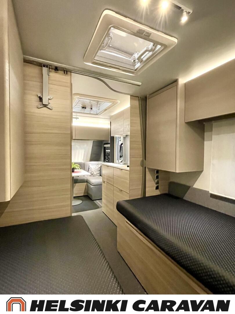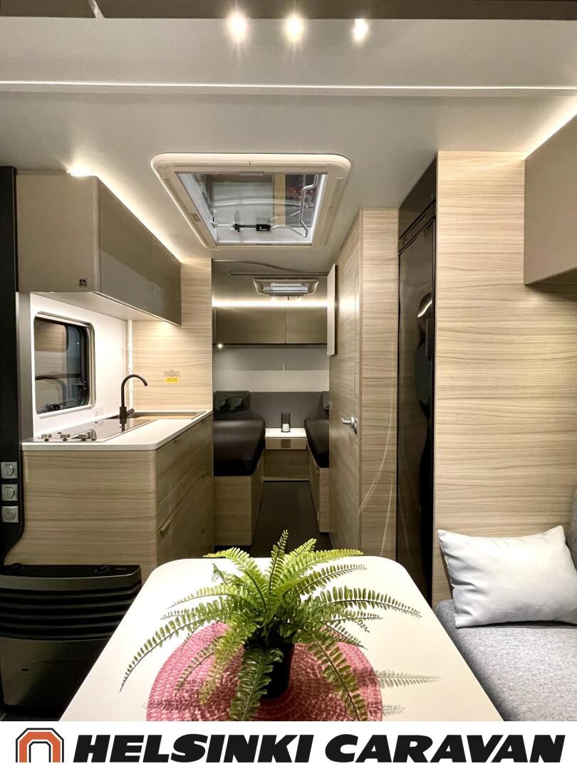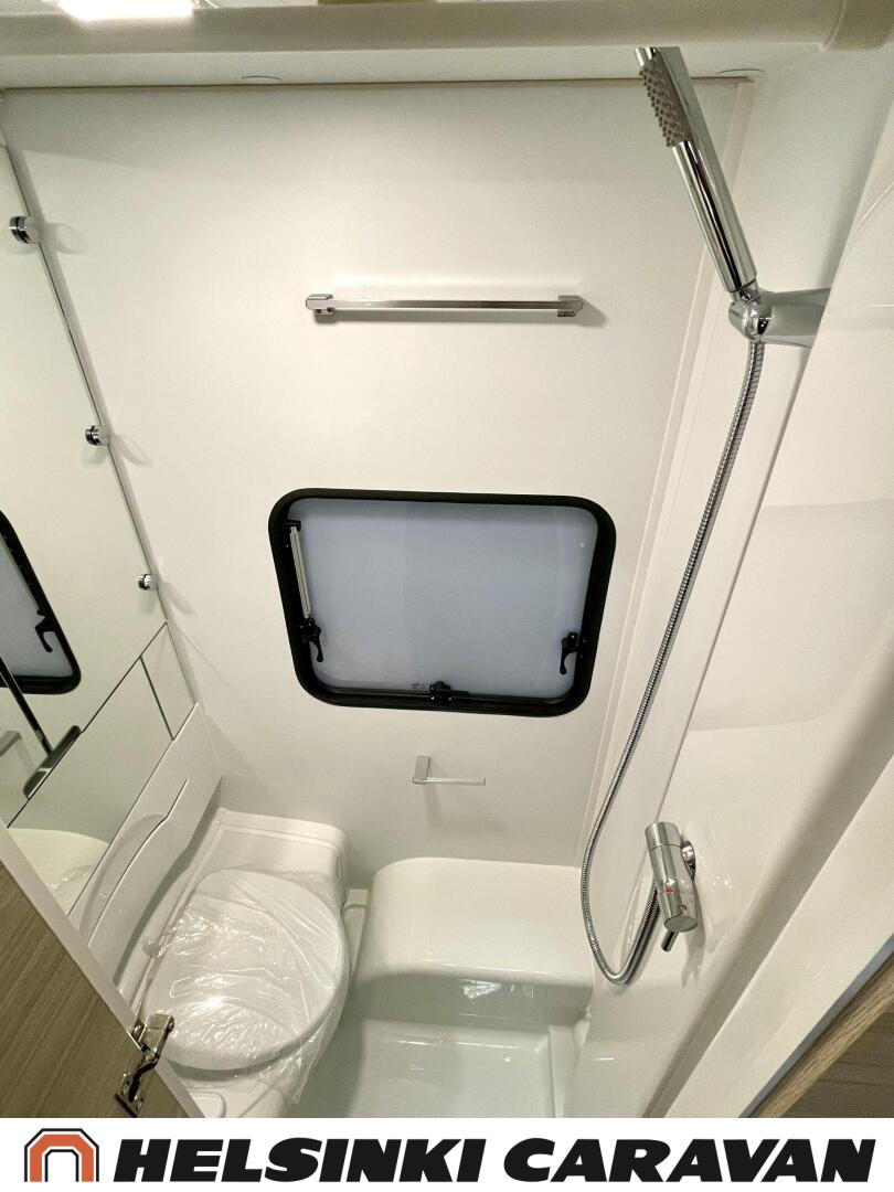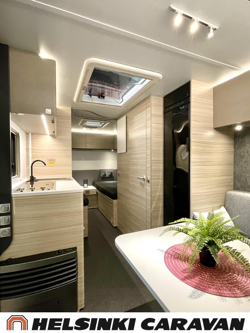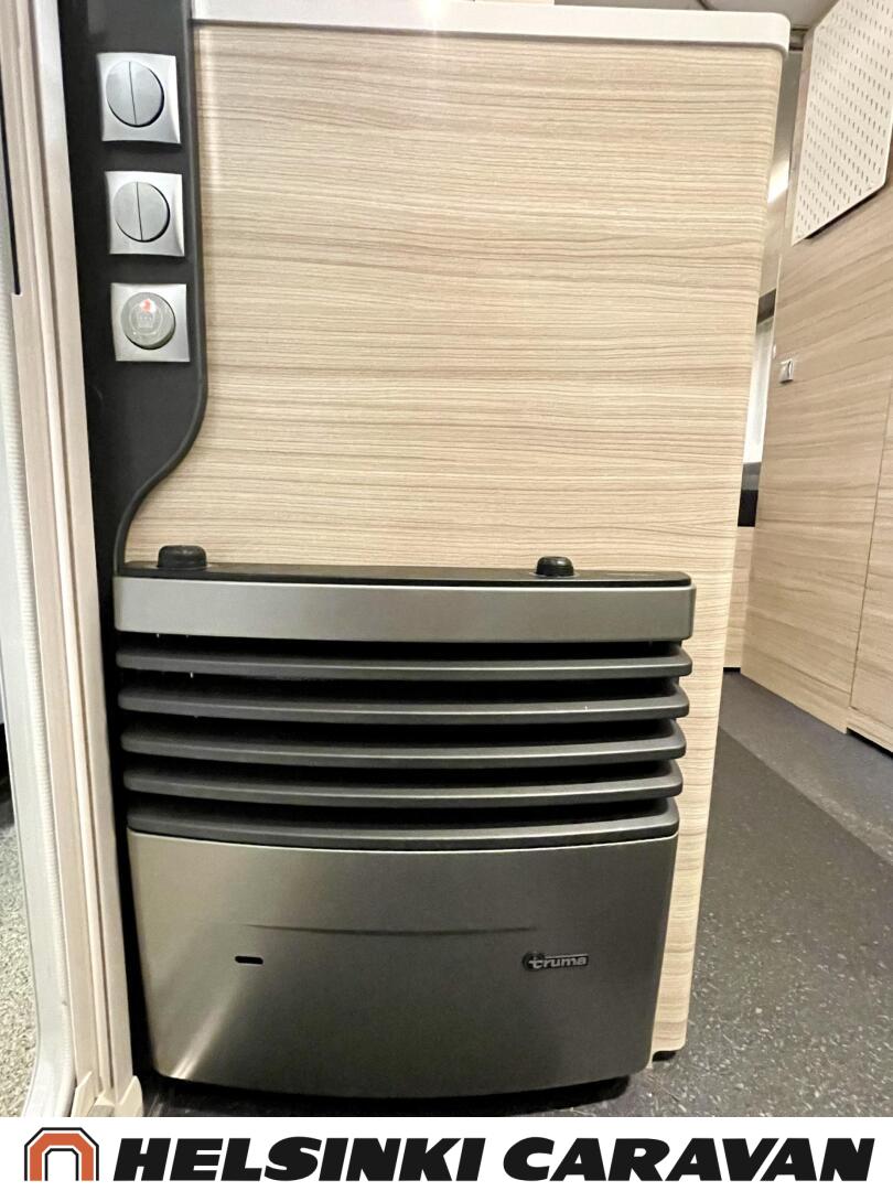 Fridge, Cassette WC, Cassette blinds, Roof hatch, Floor heating, Stove, Hot water boiler, Truma, Passenger area carpets, Sun shade, Freezer compartment, Double bed, Sink, Electric heating cartridge, TV-antenni tai lautasantenni, Support legs, Lattialämmitys (sähkö), kwh-mittari, jenkkijääkaappi, sähkön ulosotto, televisio, Asuinosan hyttysovi/verho