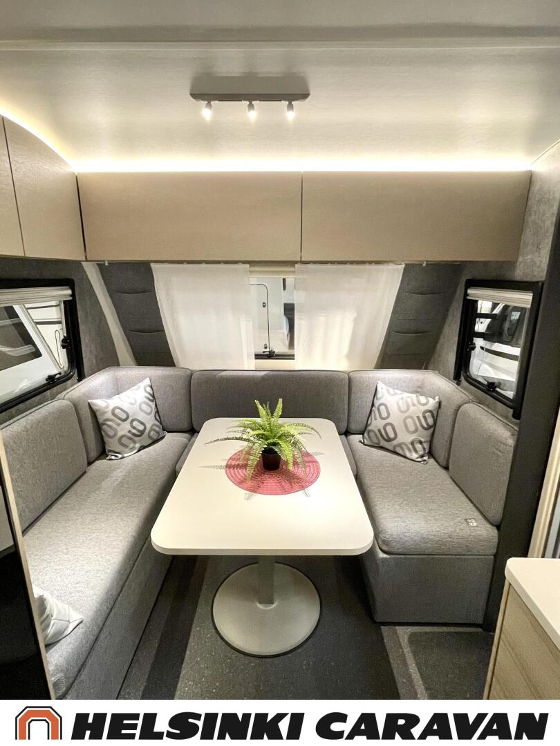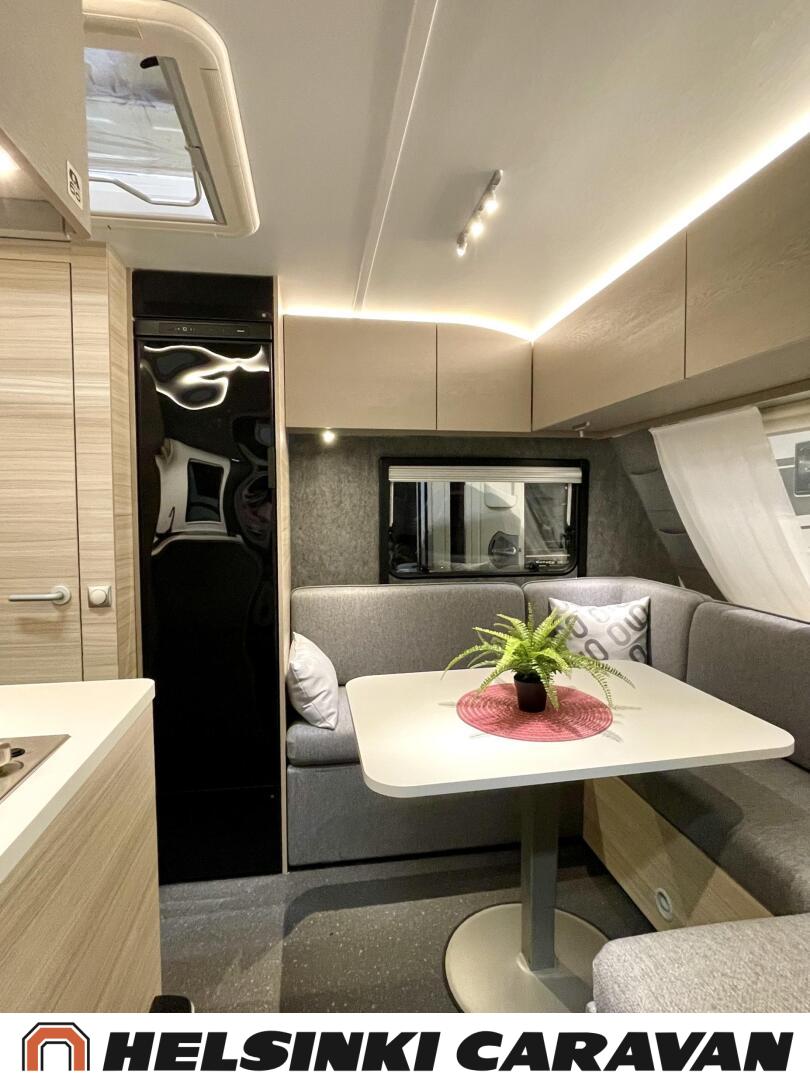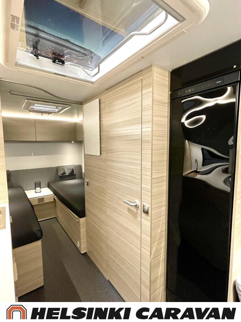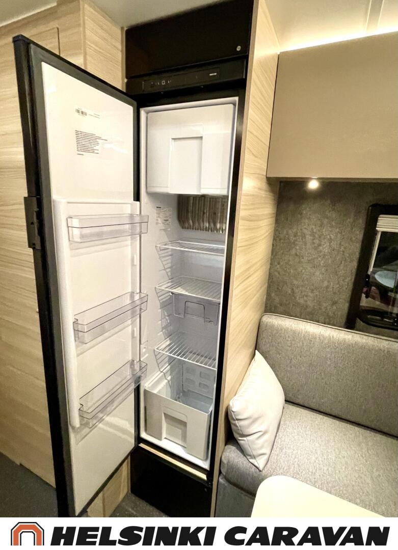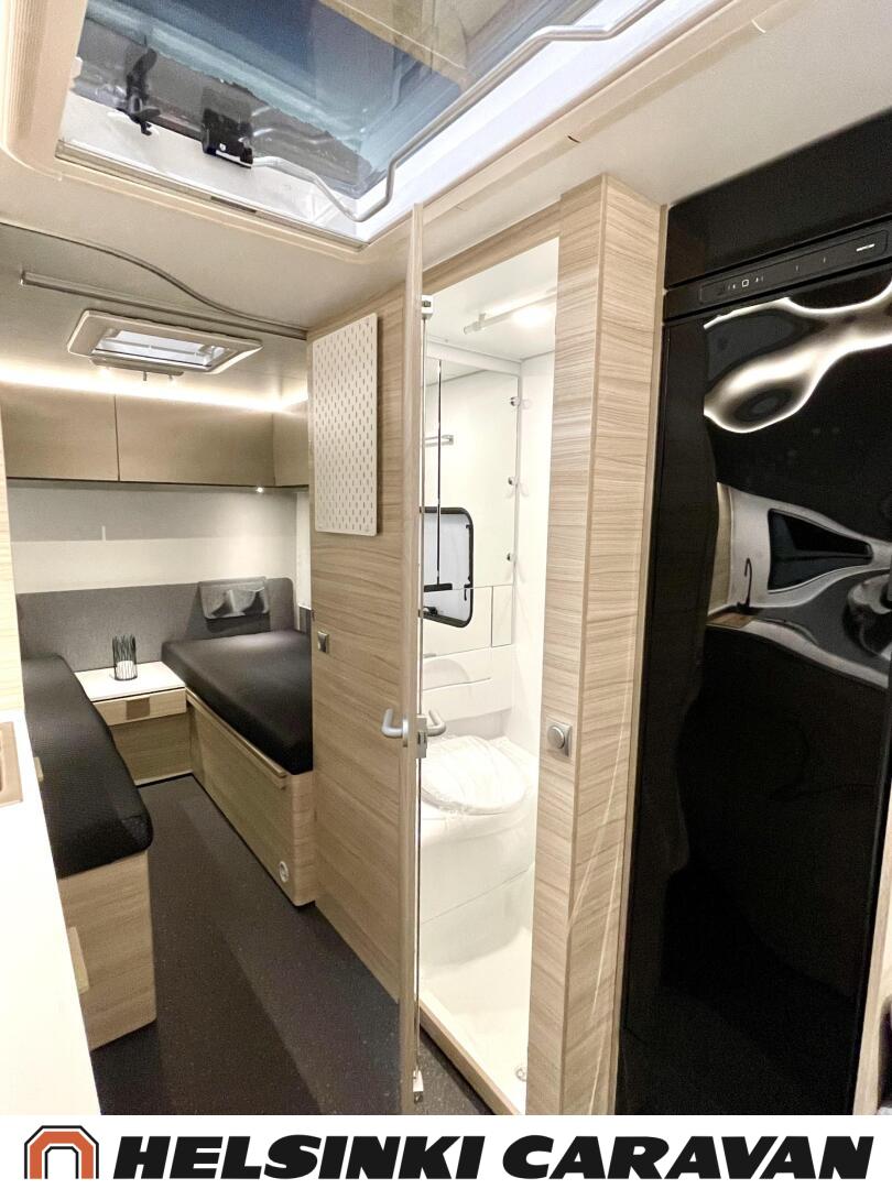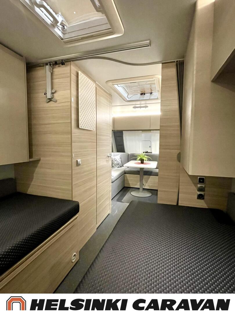 Fridge, Cassette WC, Cassette blinds, Roof hatch, Floor heating, Stove, Hot water boiler, Truma, Passenger area carpets, Sun shade, Freezer compartment, Double bed, Sink, Electric heating cartridge, TV-antenni tai lautasantenni, Support legs, Lattialämmitys (sähkö), kwh-mittari, jenkkijääkaappi, sähkön ulosotto, televisio, Asuinosan hyttysovi/verho