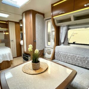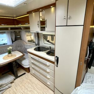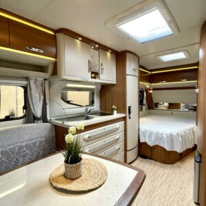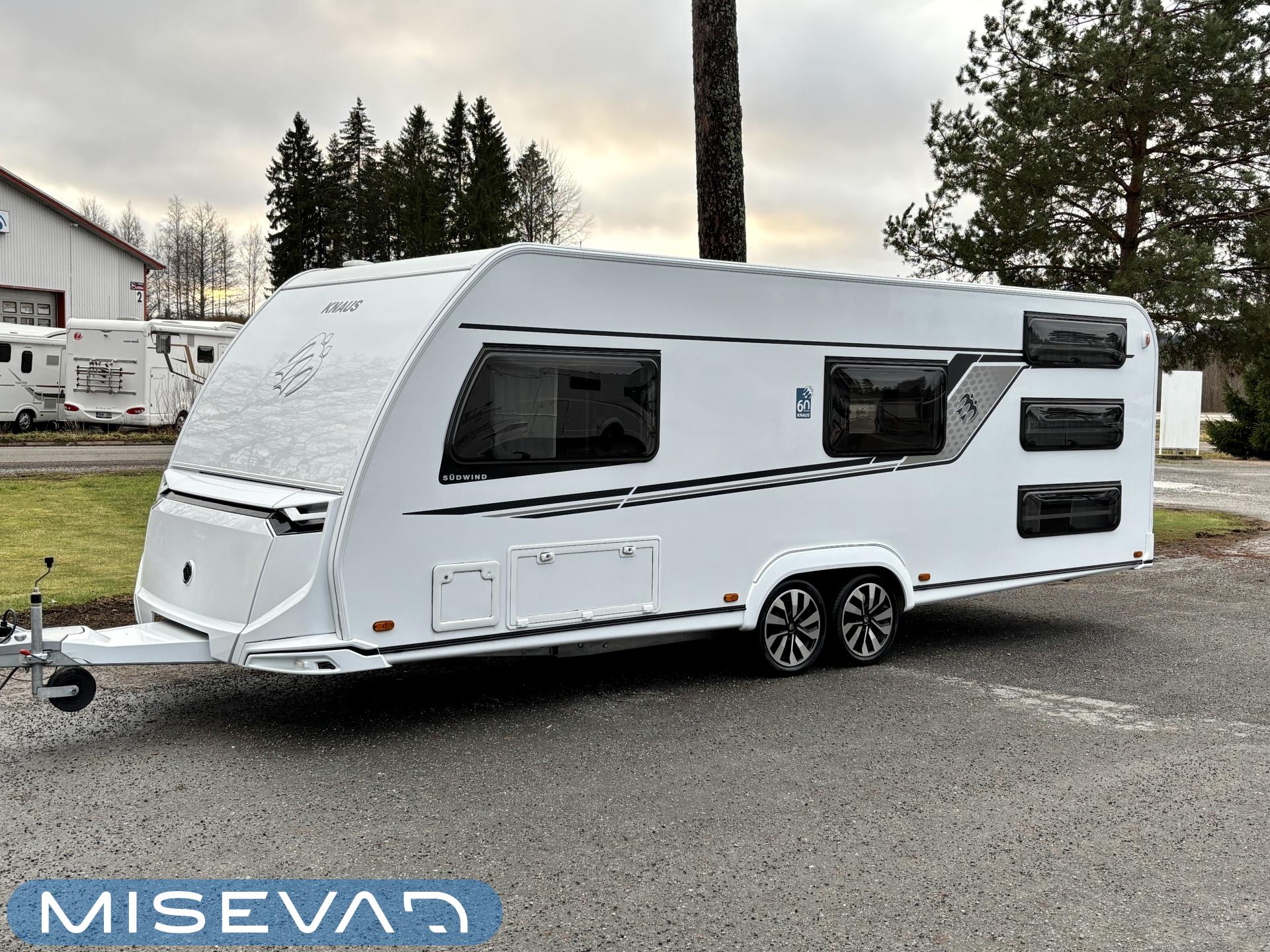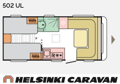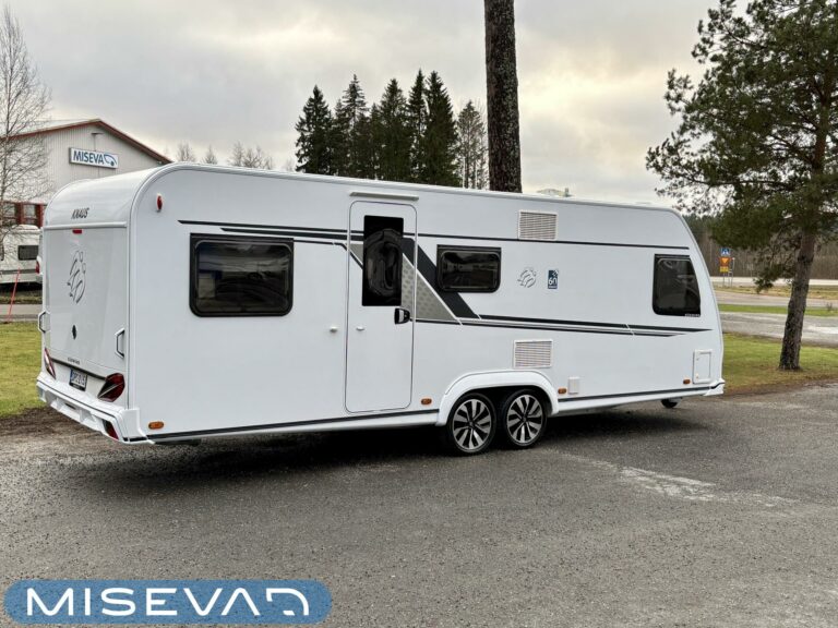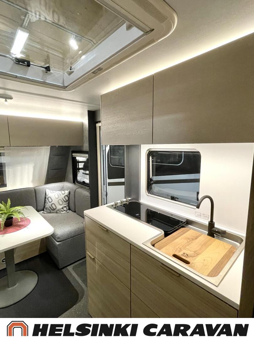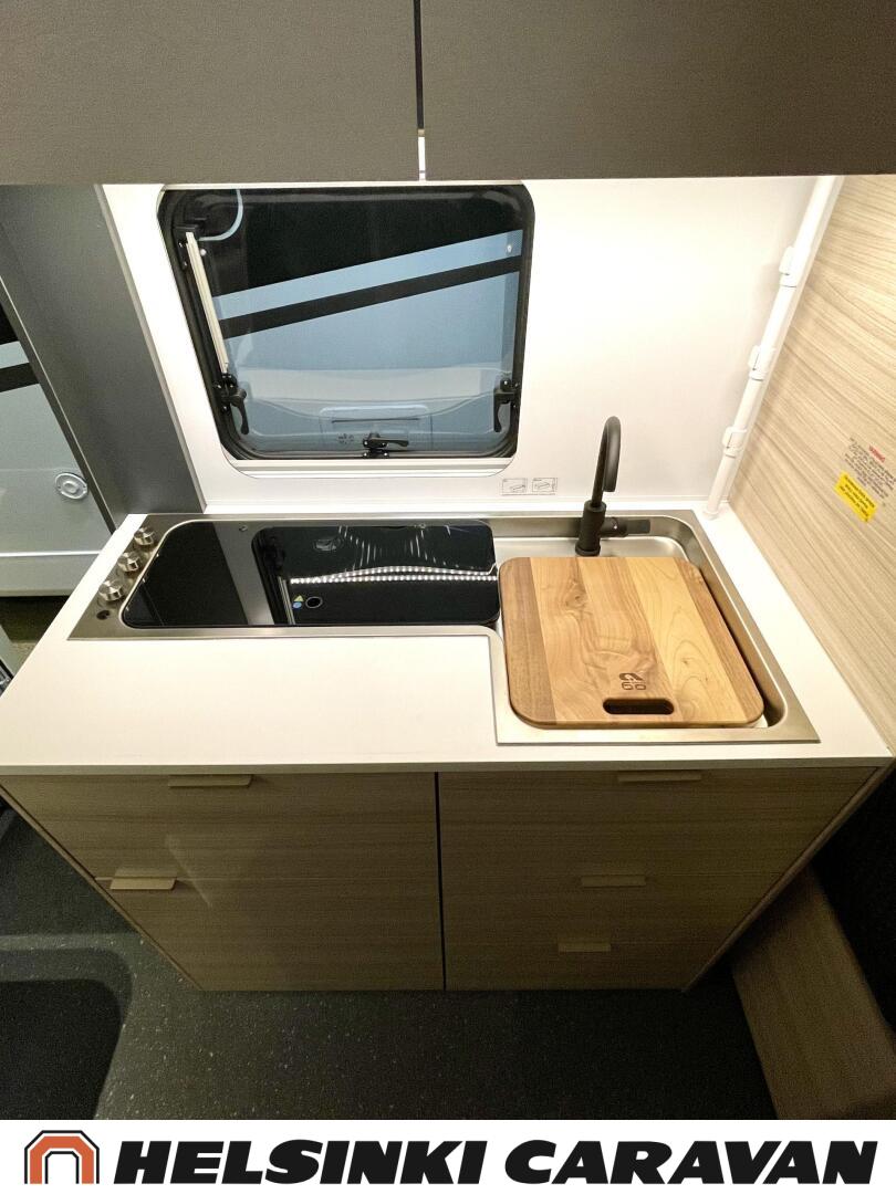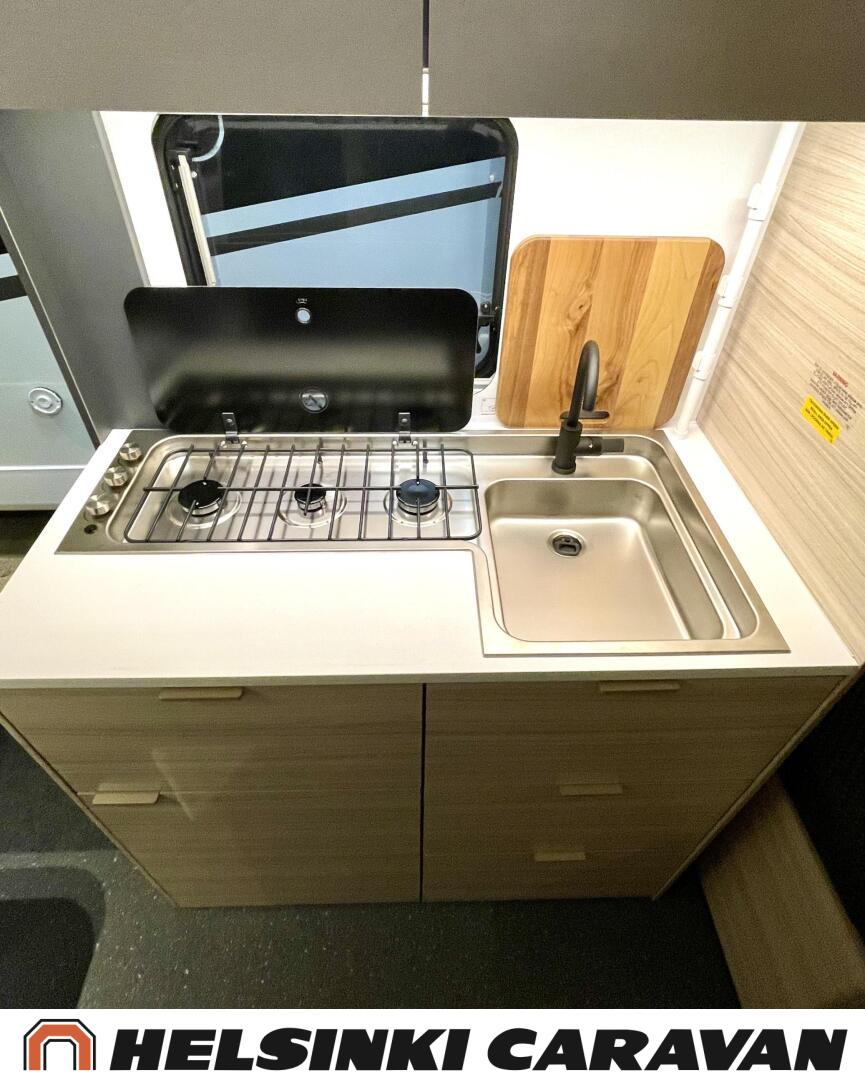 Fridge, Cassette WC, Cassette blinds, Roof hatch, Floor heating, Stove, Hot water boiler, Truma, Passenger area carpets, Sun shade, Freezer compartment, Double bed, Sink, Electric heating cartridge, TV-antenni tai lautasantenni, Support legs, Lattialämmitys (sähkö), kwh-mittari, jenkkijääkaappi, sähkön ulosotto, televisio, Asuinosan hyttysovi/verho