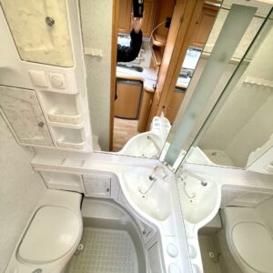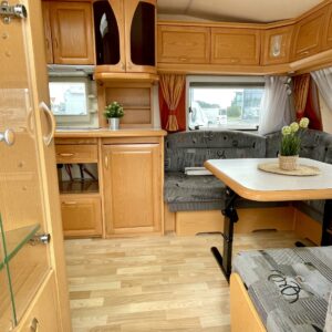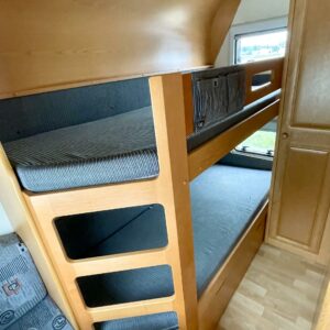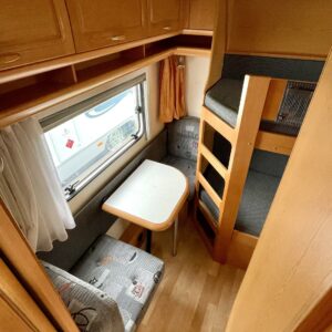 Truma, Fridge, Cassette WC, Cassette blinds, Roof hatch, Bunk bed, Stove, Hot water boiler, Freezer compartment, Double bed, Sink, TV-antenni tai lautasantenni, Support legs, kwh-mittari, sähkön ulosotto