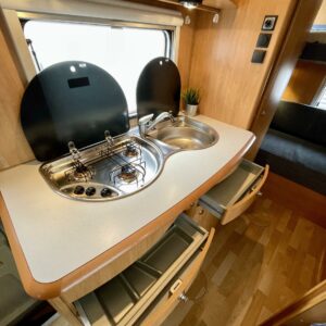 Bicycle rack, Sun shade, Truma, Fridge, Cassette WC, Cassette blinds, Roof hatch, Bunk bed, Stove, Hot water boiler, Freezer compartment, Power steering, Sink, Radio, Shower, Double bottom, Turbo